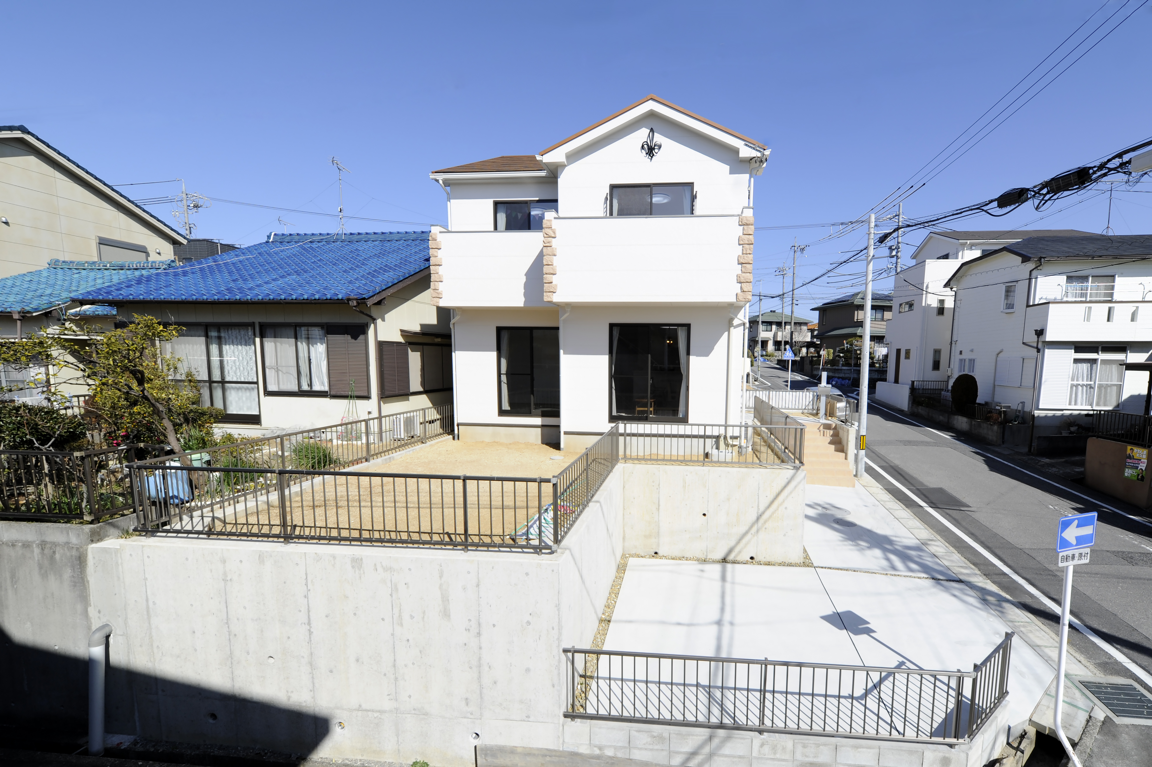 敷地面積30坪、建築面積14坪、延べ床面積35坪(4LDK)、駐車場2台駐車、屋上庭園10坪