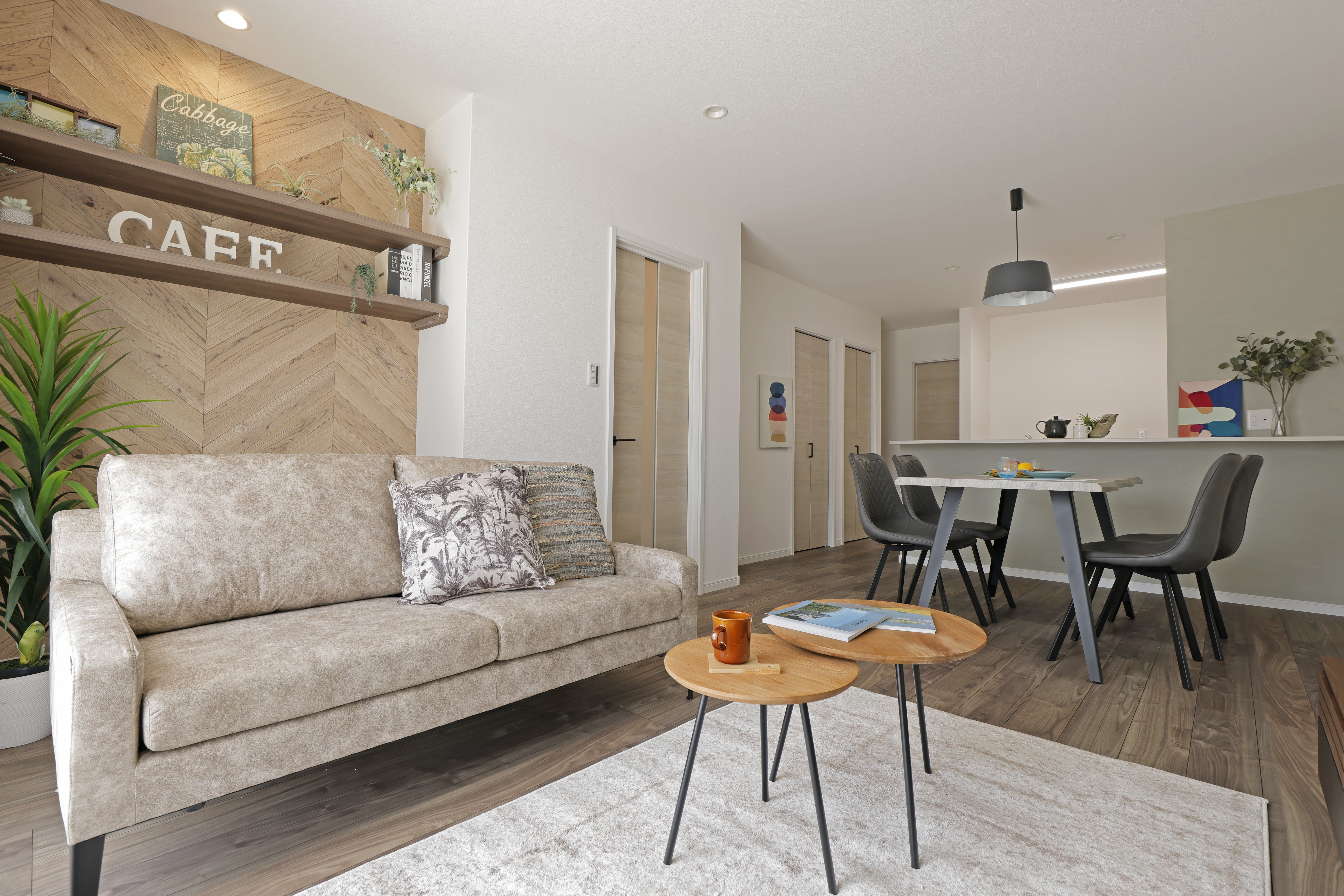16.78帖のLDKです。家族の様子を感じながら家事ができる対面キッチン、キッチンの横にはクローゼット二つ分のパントリーもあるので生活用品の収納場所に困りません。