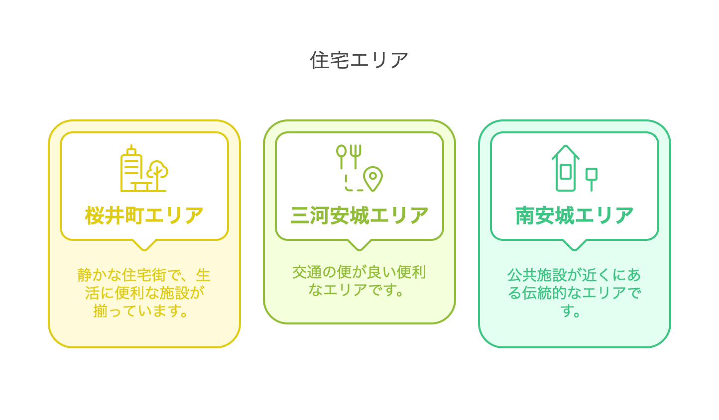 桜井町は、名鉄西尾線「桜井駅」周辺に広がるエリアで、閑静な住宅街が特徴です。スーパーやドラッグストアも充実しており、生活の利便性が高い一方で、落ち着いた環境が魅力。子育て世代に人気のエリアです。