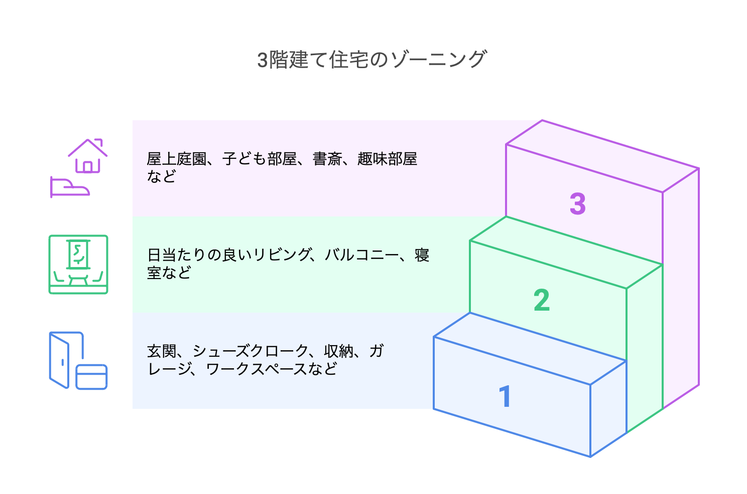 3階建て住宅では、生活空間をフロアごとに明確に分ける「ゾーニング」がしやすくなります。