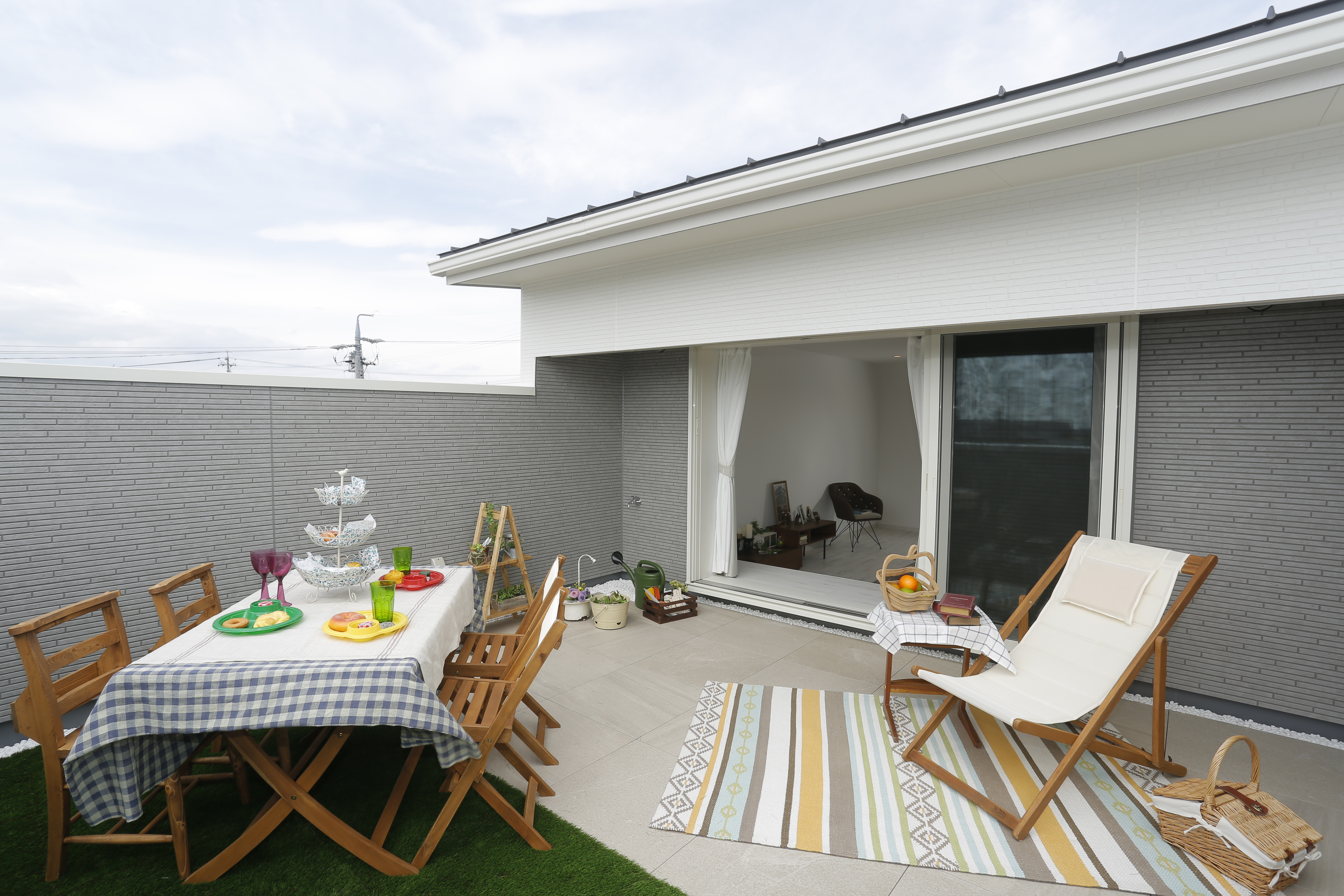 人工芝を敷いた空間には、プールを出したり、子どもたちが走り回ったりできるプライベートなお庭のような役割があります。