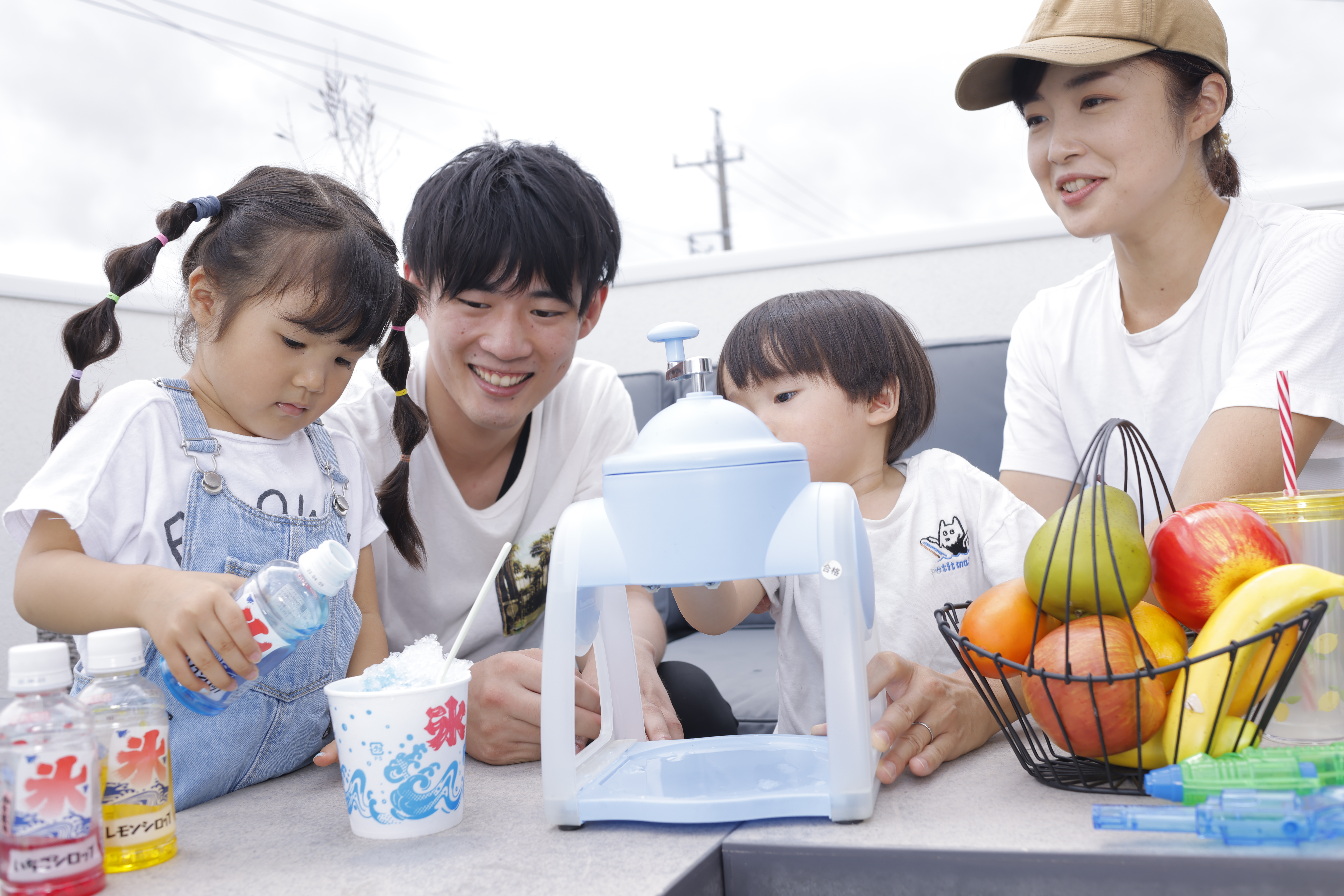 階段を上がった先にある広々とした屋上庭園は、週末のバーベキューや子どものプール遊びにもぴったり。リビングからの延長空間としても活用でき、30坪台でも「開放感ある暮らし」が実現できます。