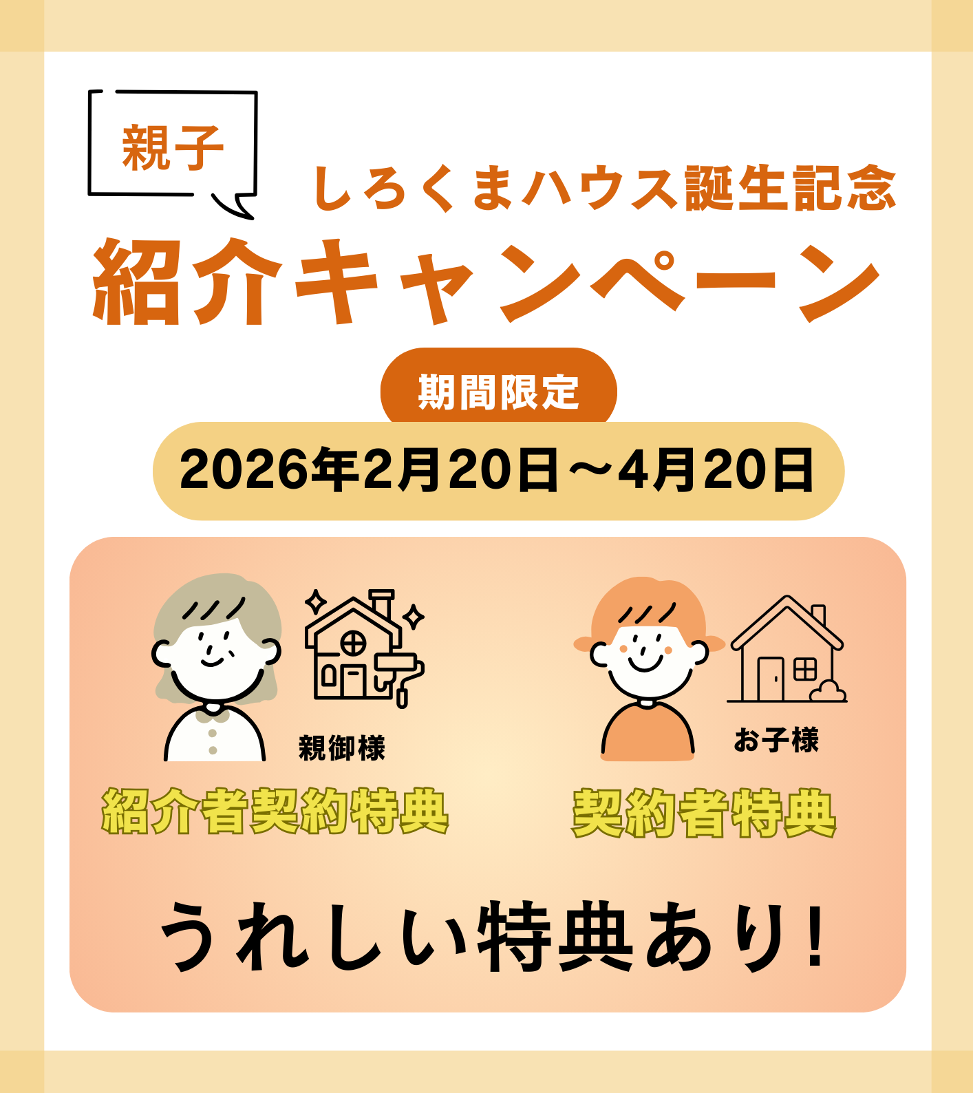 見学会 しろくまハウス誕生記念!親子紹介キャンペーン! 開催期間 2026年2月20日~4月20日 開催場所 ナカオホーム本社併設モデルハウス このイベントを予約する 【★☆期間限定キャンペーン☆★】 最近は2~30代のお子様のお家づくりを 一緒にご見学される親御様が増えています! マイホームを検討中のお子様がいる親御様対象! 高性能住宅しろくまハウスを一緒にご見学しませんか? しろくまハウスがどんな家か知りたい方はCHECK! ♡ご来場・成約特典♡ 【キャンペーン適応条件】 ・ナカオホームで建築、またはリフォームをしたオーナー様からのご紹介 ・お子様がマイホーム建築を検討中 ・検討する商品がしろくまハウスであること