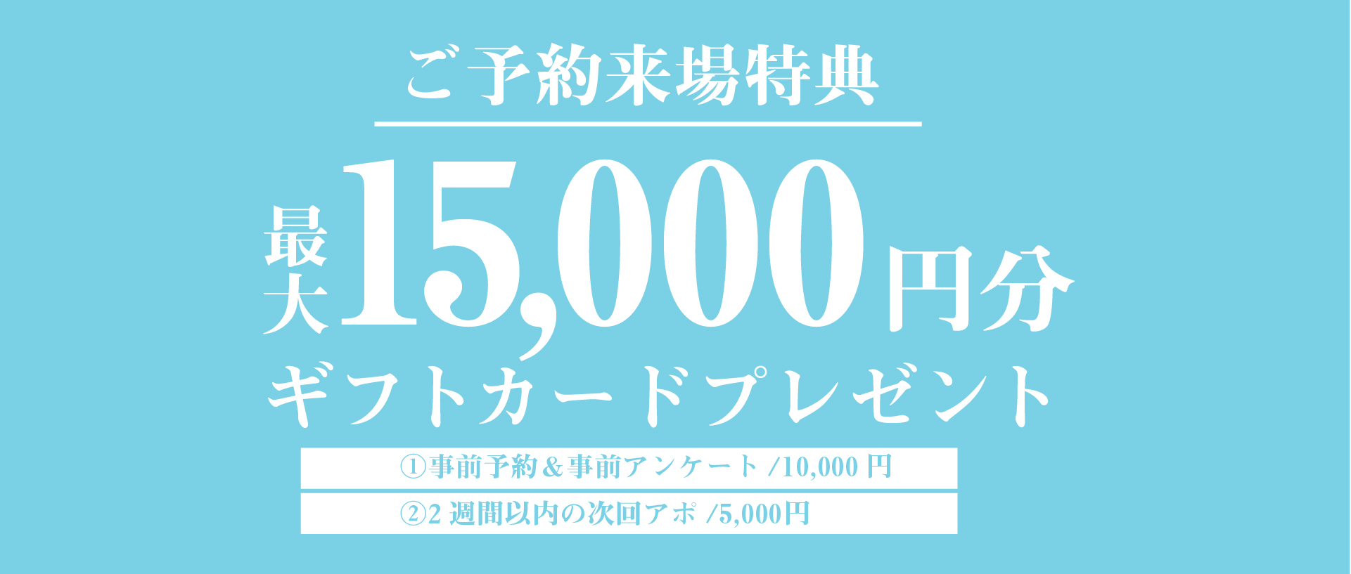 ①初回来場:10,000円分のギフトカード②次回の来場(初回来場から2週間以内に2回目の来場をして頂いた方):5,000円分のギフトカード