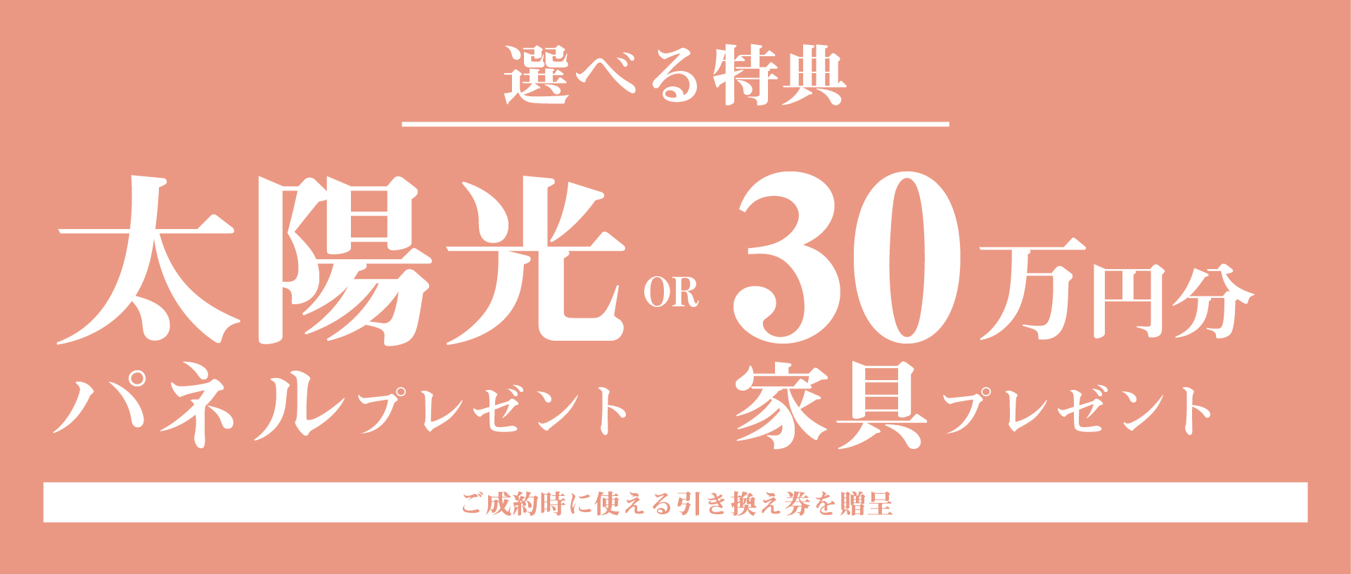 ①ご成約時:太陽光パネルプレゼント②ご成約時:30万円分家具プレゼント
