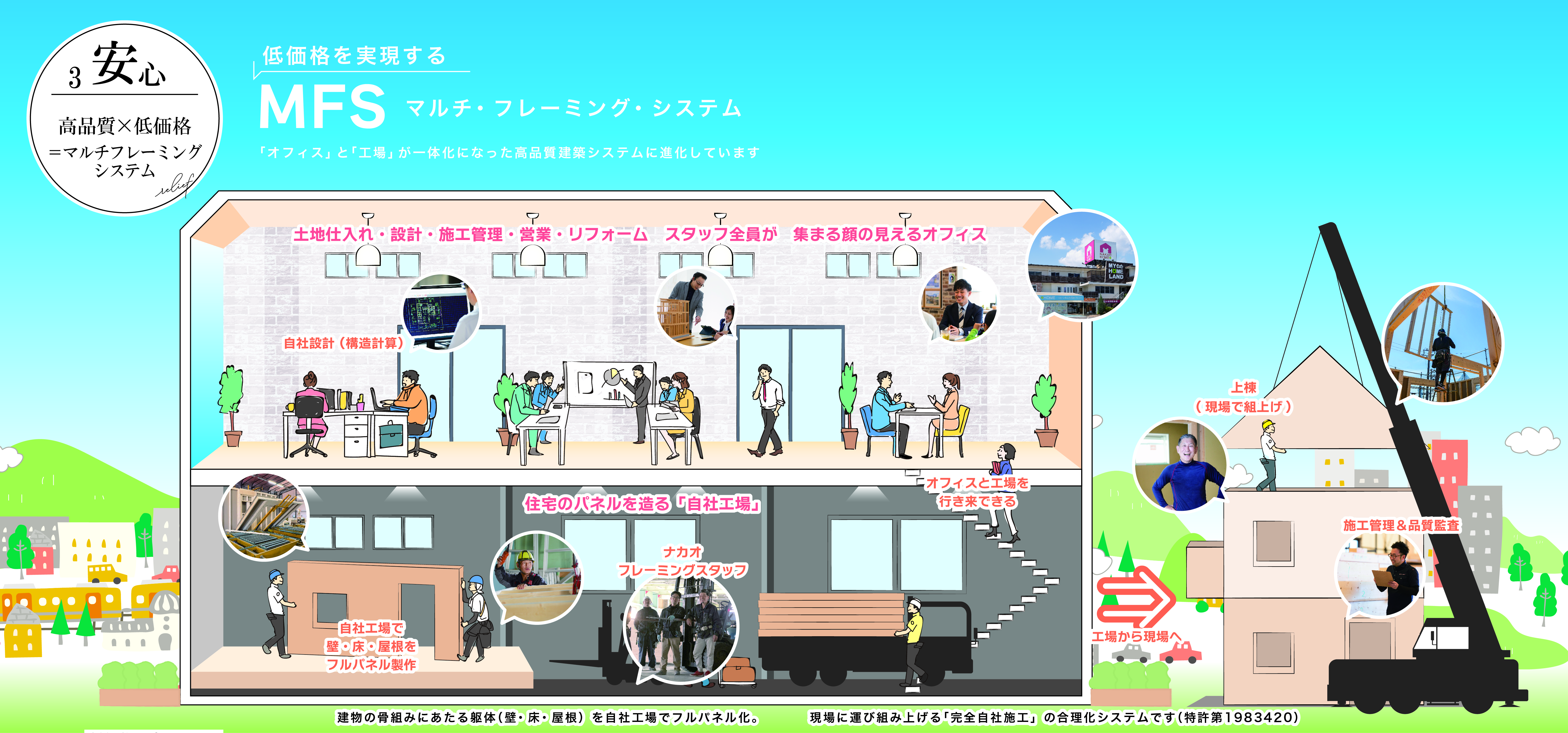 現場に運び組み上げる「完全自社施工」の合理化システム(特許第1983420)のことを言います。