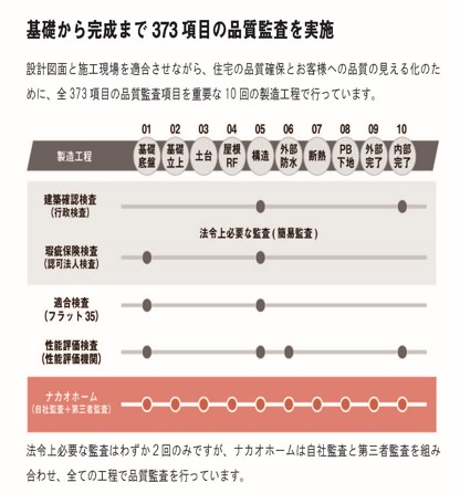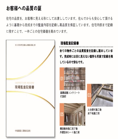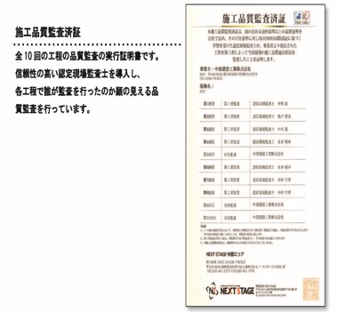 ナカオホームの責任とは製造責任である。製造責任とは、請負契約内容に準じた仕様・性能・品質などを現場製造過程で履行する責任になります。他の製造業に比べ、住宅業界は製造責任を履行する為の第三者監査の導入が少ないと言われている。ナカオホームは製造責任者として、安心にて住むことのできる品質の家を、お客様に届けることをの証しを『品質監査証』としてお渡ししています。