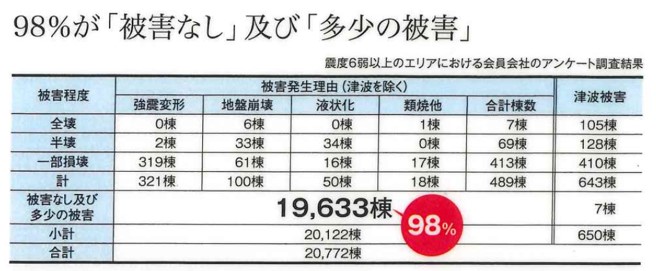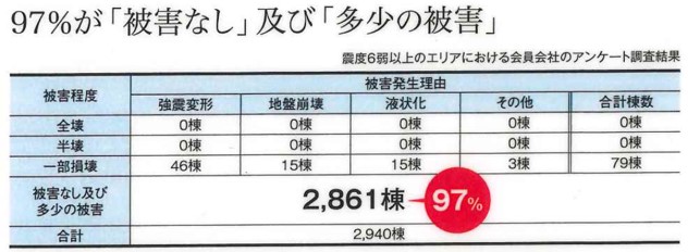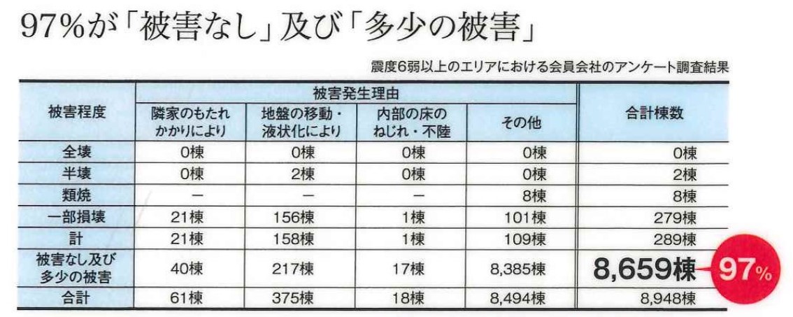 その前震・本震以降も、震度5以上の余震が多発し、建物は強い揺れを何度も受けましたが、ツーバイフォー住宅は「被害なし」「多少の被害」の住宅が97%以上を占めました。