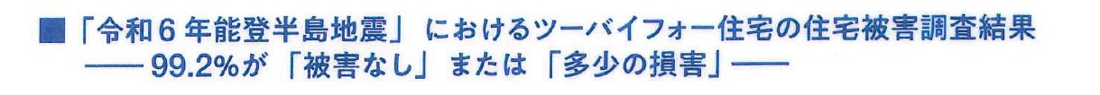 石川県能登半島を中心に強い揺れが観測された「令和6年能登半島地震」においてのツーバイフォー住宅の被害状況を調査しました。地盤崩壊や液状化等の立地に起因する被害を除き、揺れにより変形した物件はなく、「多少の被害・被害なし」の程度にとどまったツーバイフォー住宅が全体の99.2%を占めました。