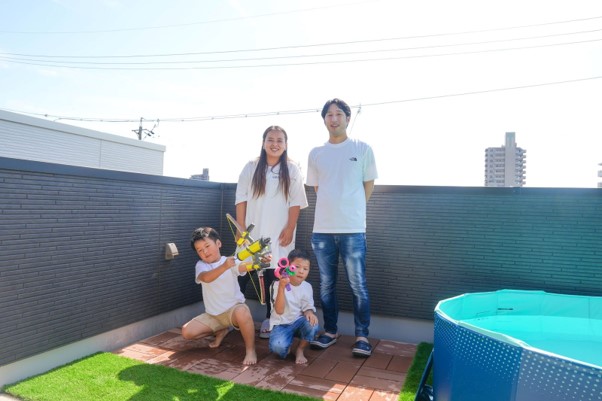 社宅での住める期間が決まっていたS様は4年ほど前から少しずつおうち探しを始めて様々な物件を見学されたそうです。子供たちが育っていく中で子供たちのことを考えたら今住んでいる環境は変えたくない!という奥様の想いを汲み、学区限定でのおうち探しをされました。希望エリアの土地価格が高騰する中、価格を重視するか、住み心地を重視するかという悩みは屋上庭園付3階建て住宅に出会い、解決しました。