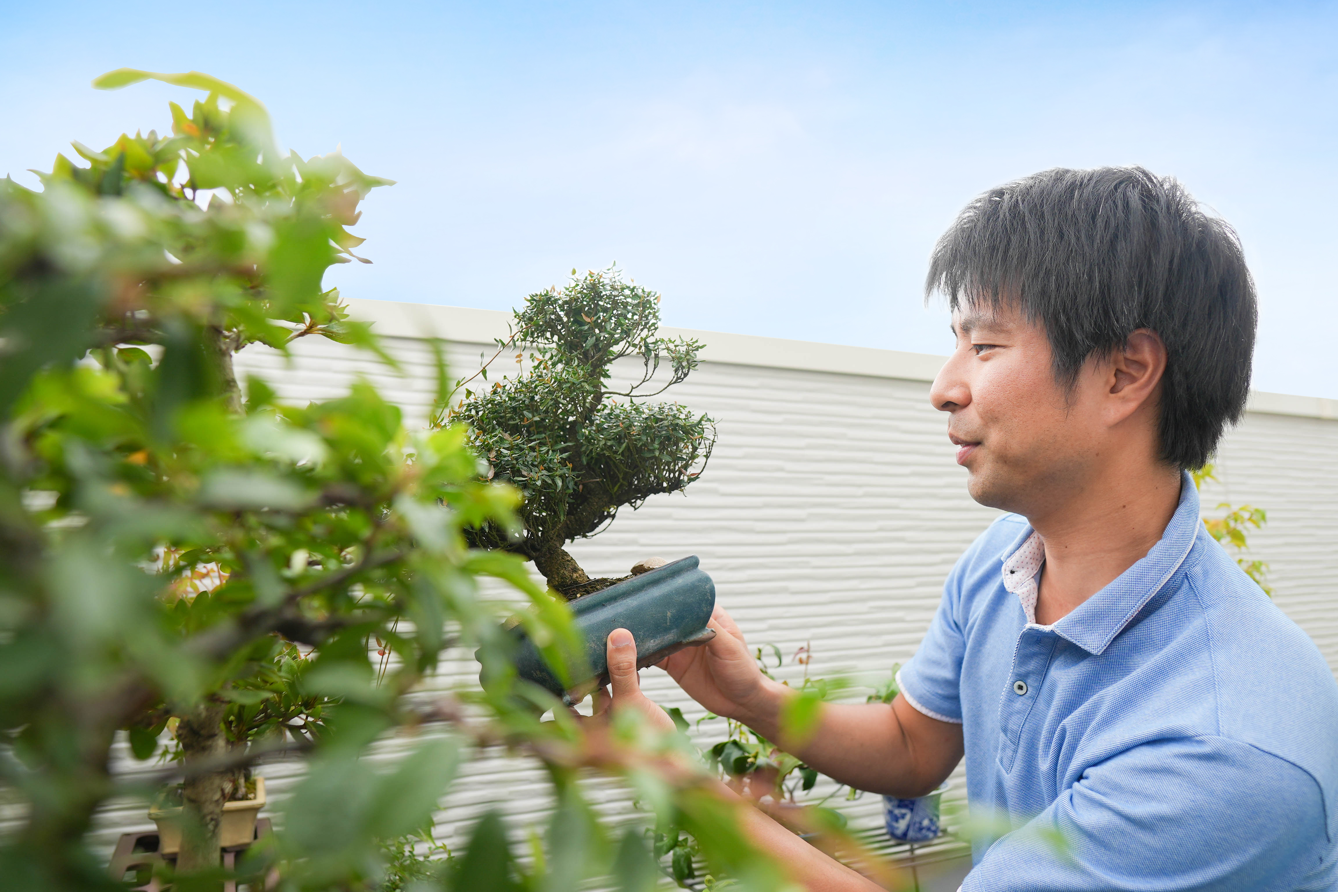 様々な種類の盆栽がおかれていて、毎朝 水やりを欠かさないことが日課のようです。