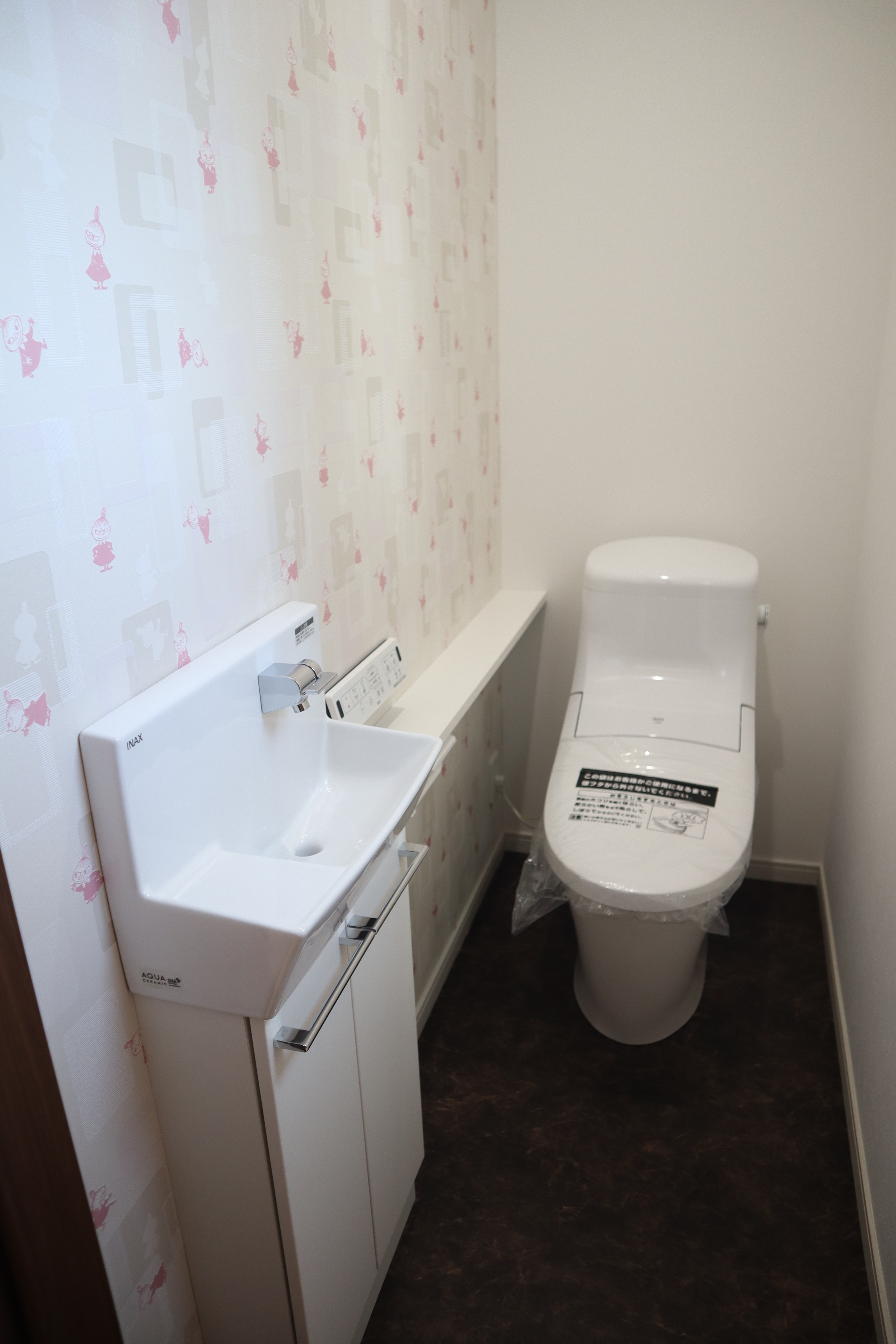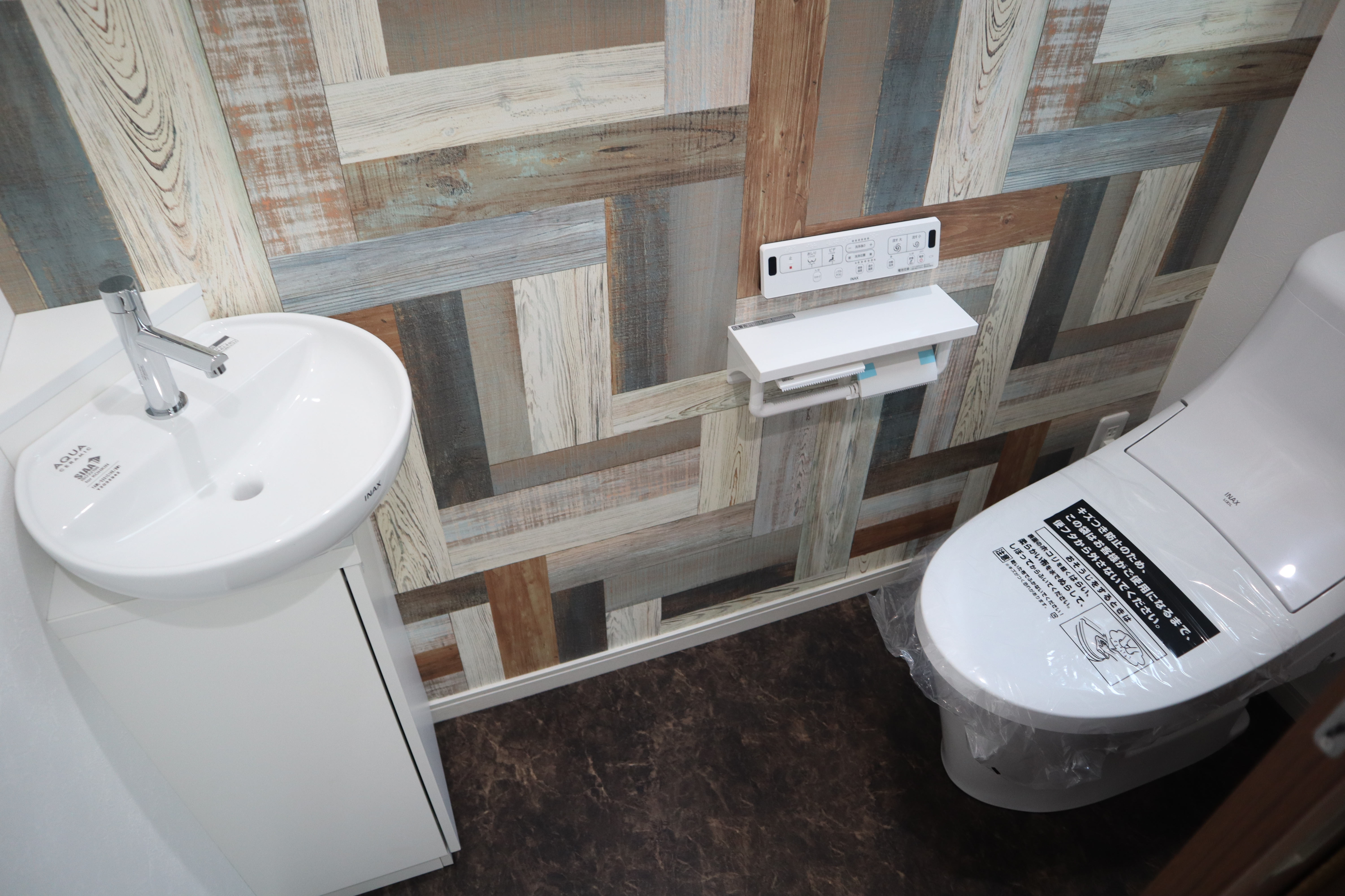 ナチュラル柄とアクセントクロスで雰囲気を変えたトイレ空間。手洗い付きで使いやすく、収納棚も備えた、デザイン性と機能性を両立した清潔感のある空間です。