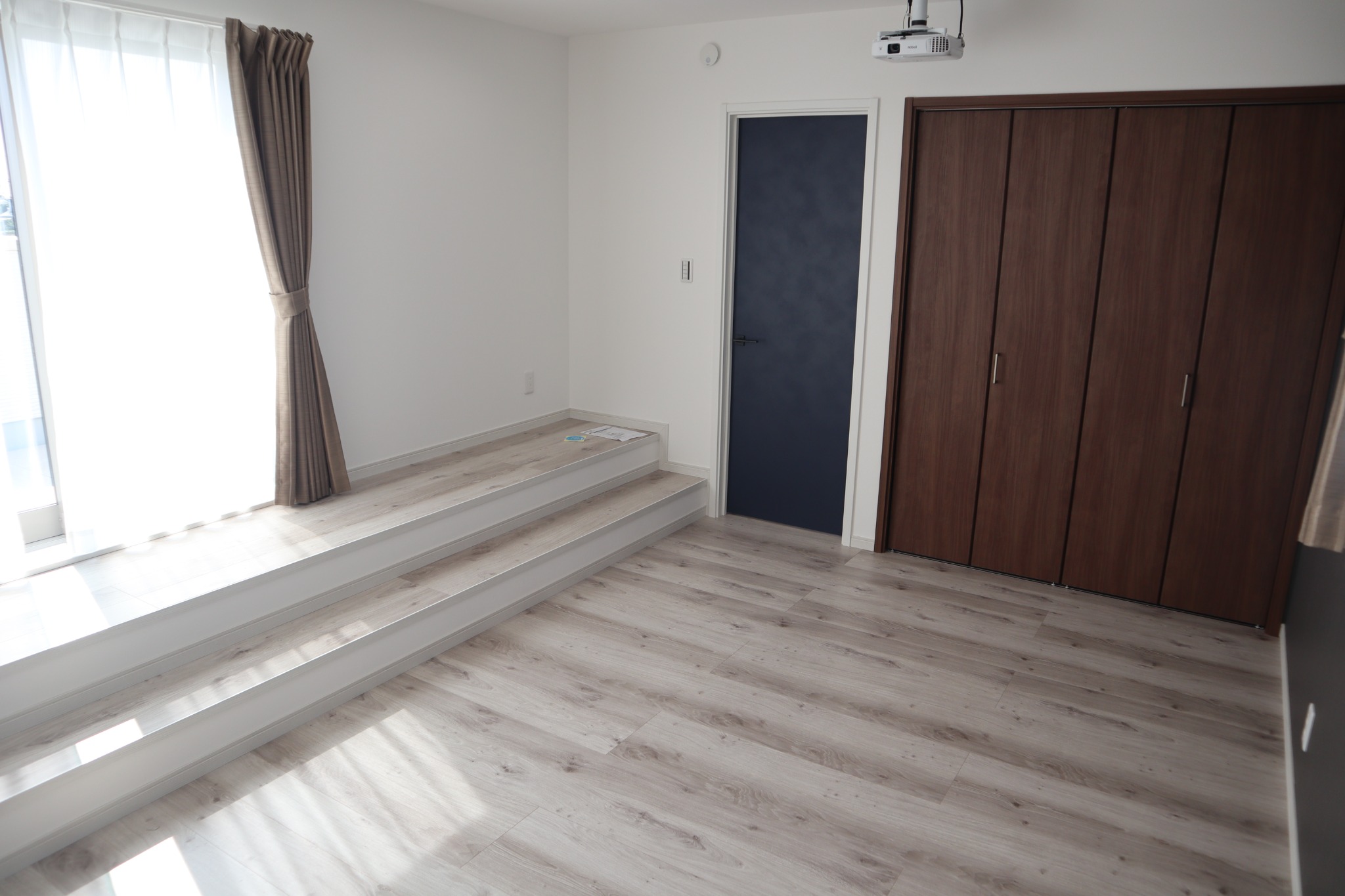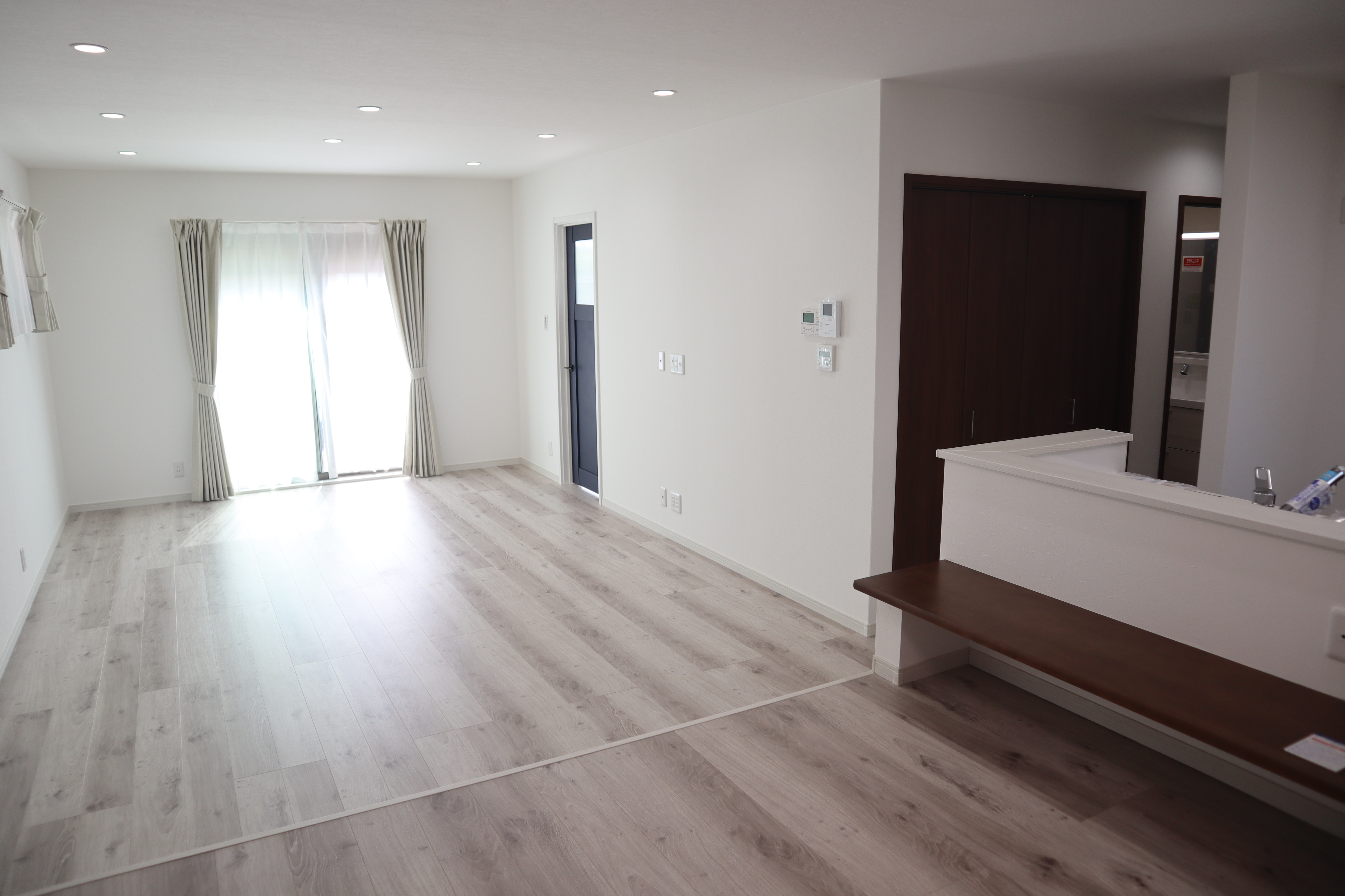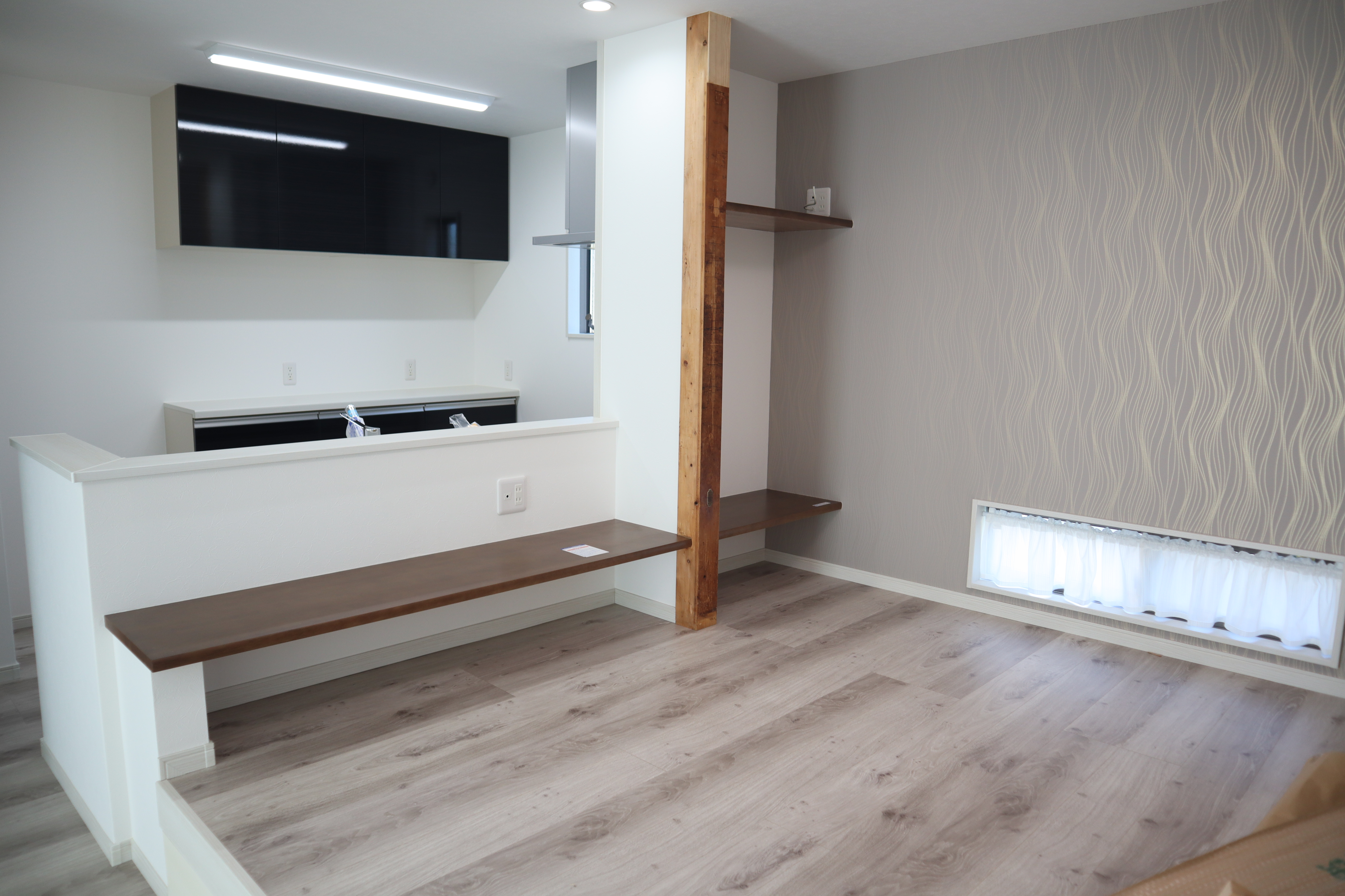 キッチンと小上がりがゆるやかにつながるLDK。腰掛けや収納として使える段差が、暮らしに便利さとくつろぎをプラスします。