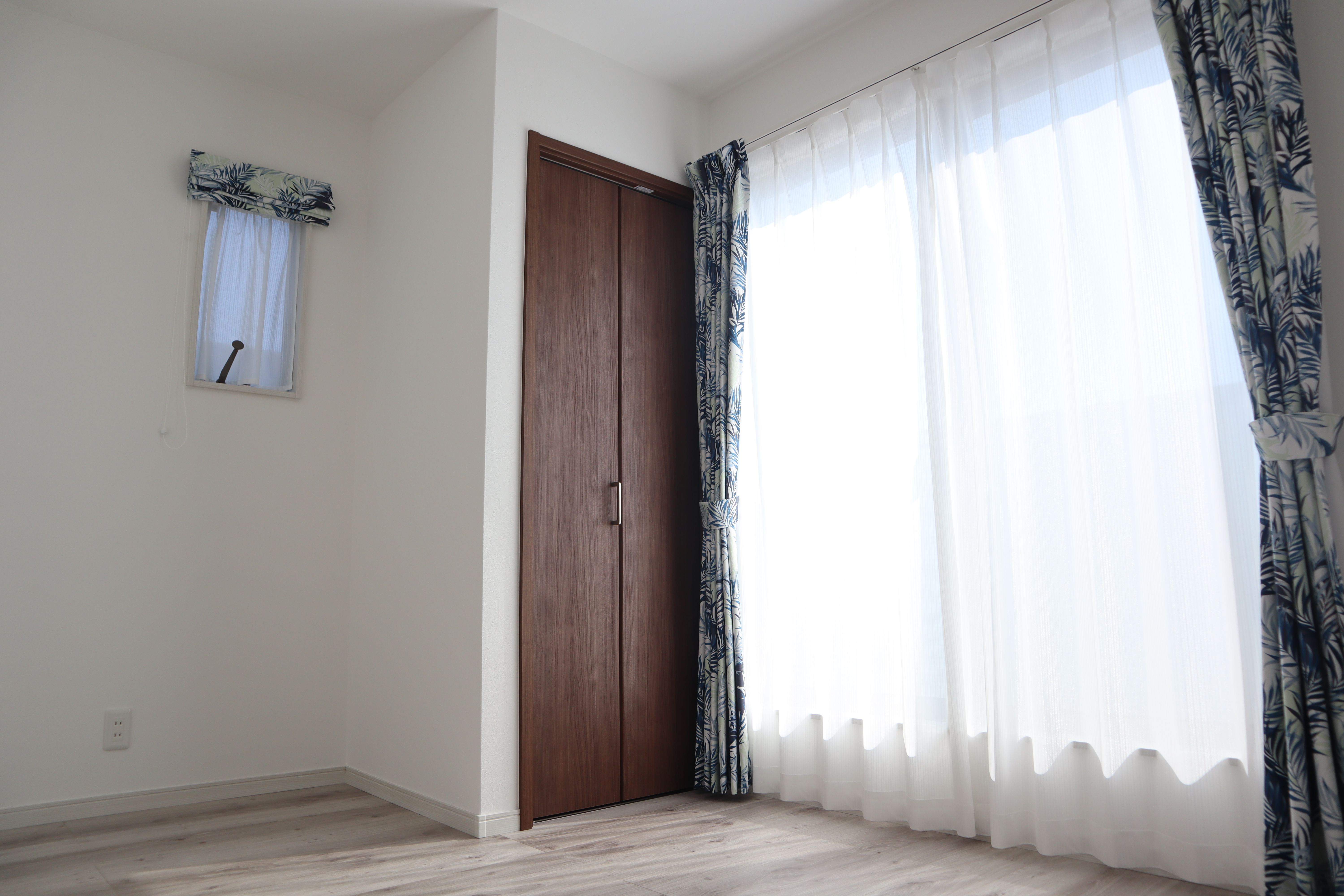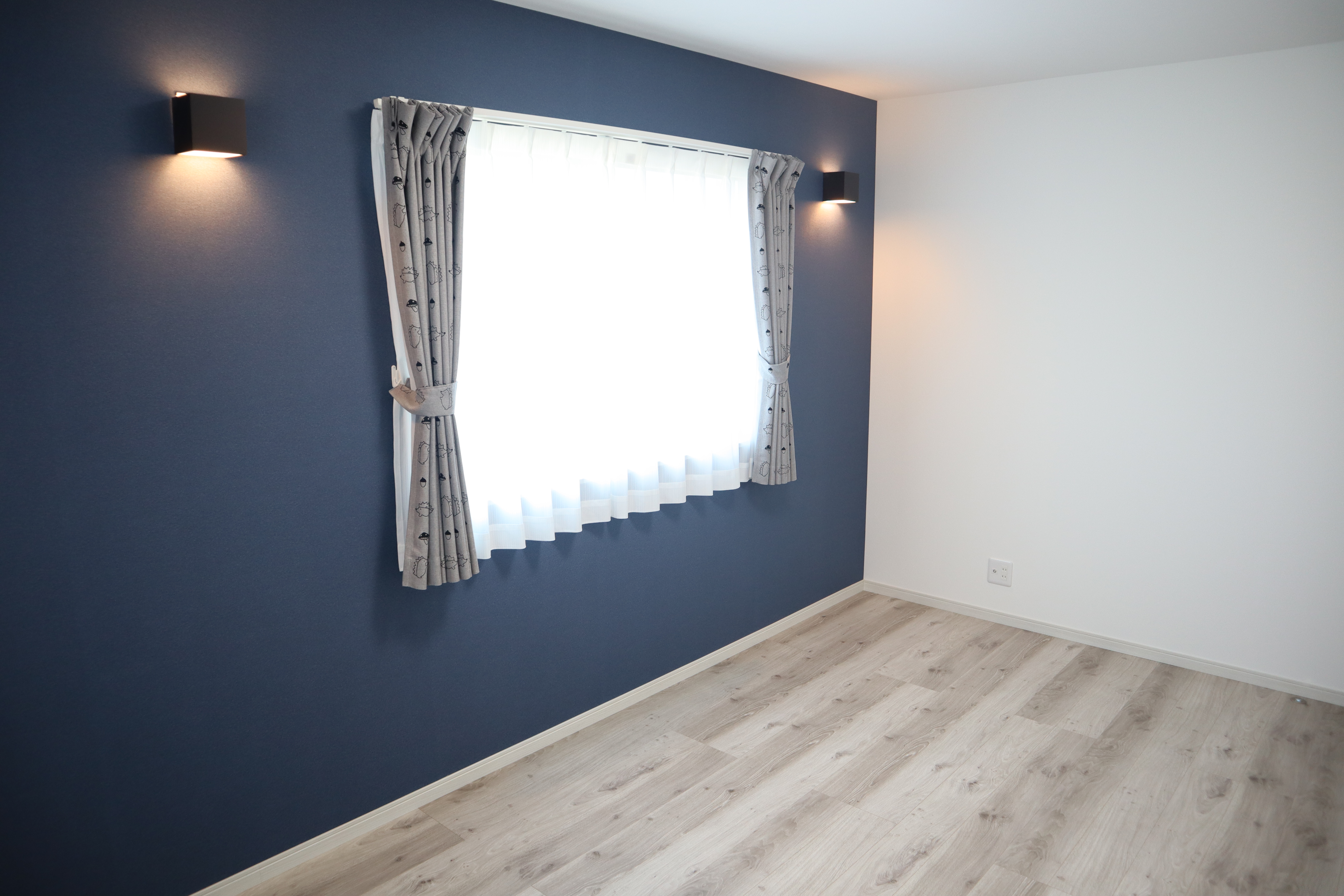 ネイビーのアクセントクロスと間接照明が落ち着いた雰囲気を演出。自然光がやさしく入る窓と、柄入りカーテンが空間に彩りを添える、心地よい洋室です。