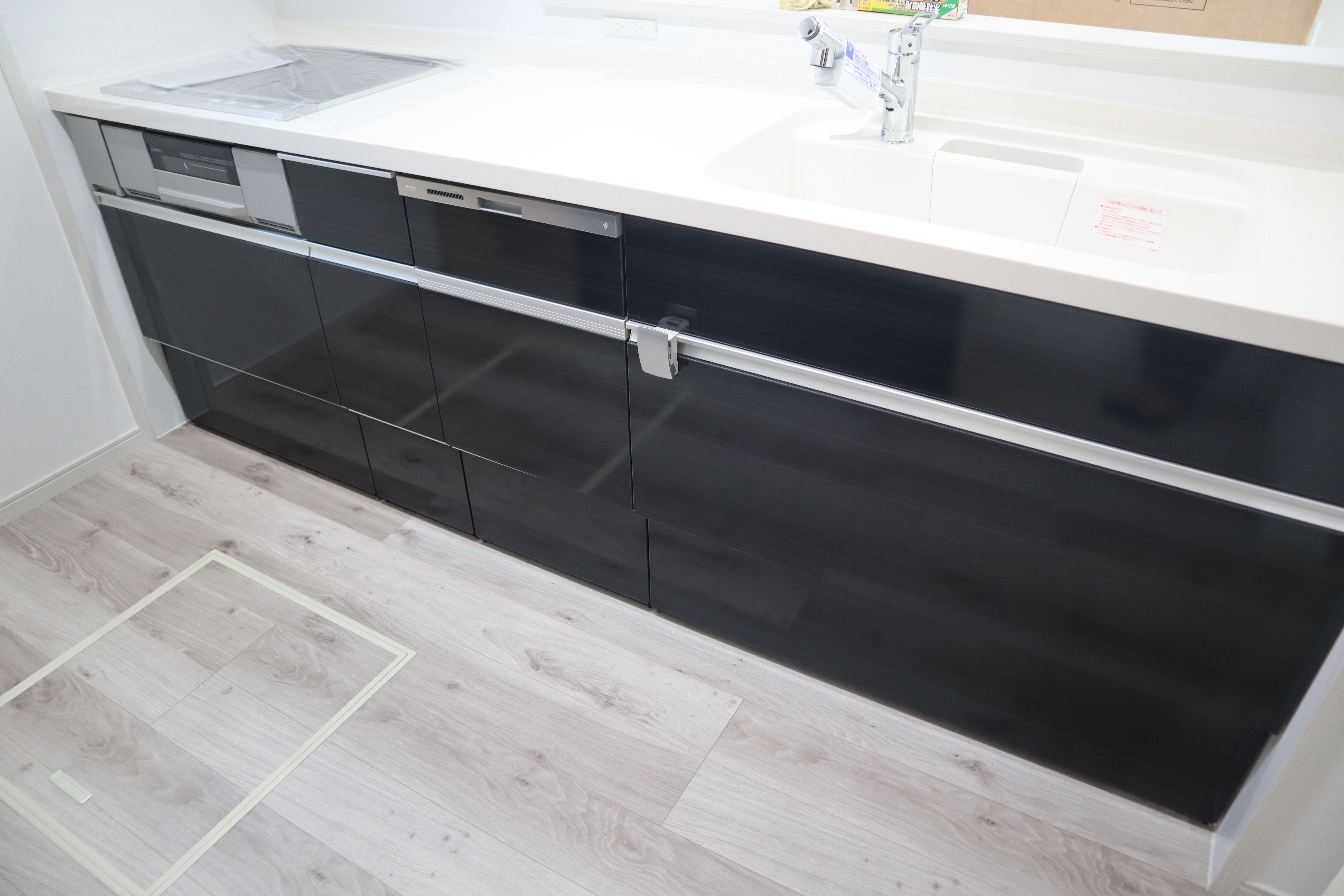 白を基調にした明るい対面キッチン。手元を隠せる腰壁とカウンター付きで、配膳や軽食にも便利。ブラックの収納扉が空間を引き締め、機能性とデザイン性を両立しています。