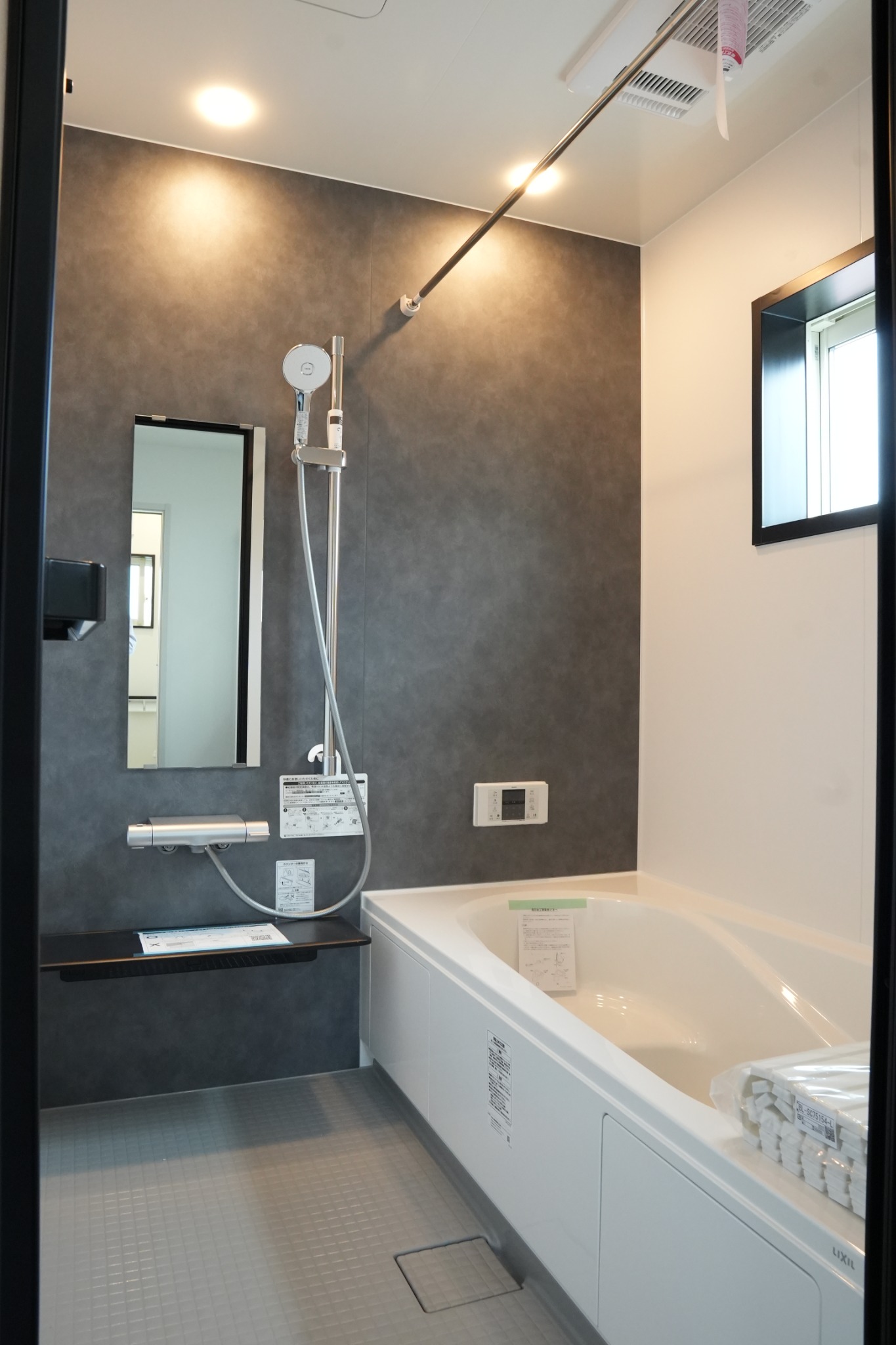 グレーのアクセントパネルが映える浴室と、ブラック基調で統一した洗面空間。素材と色のコントラストが美しく、毎日の身支度やバスタイムを上質に演出します。