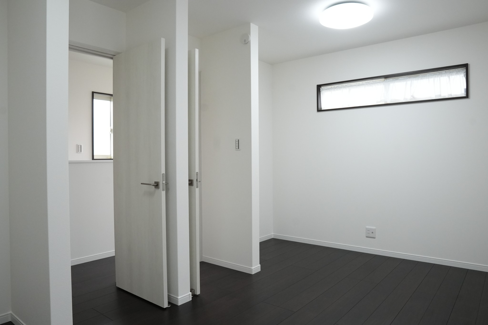 アクセントクロスが印象的な主寝室と、シンプルで使い勝手の良い個室空間。落ち着いた色合いと採光計画により、用途に応じて心地よく過ごせるプライベートルームです。