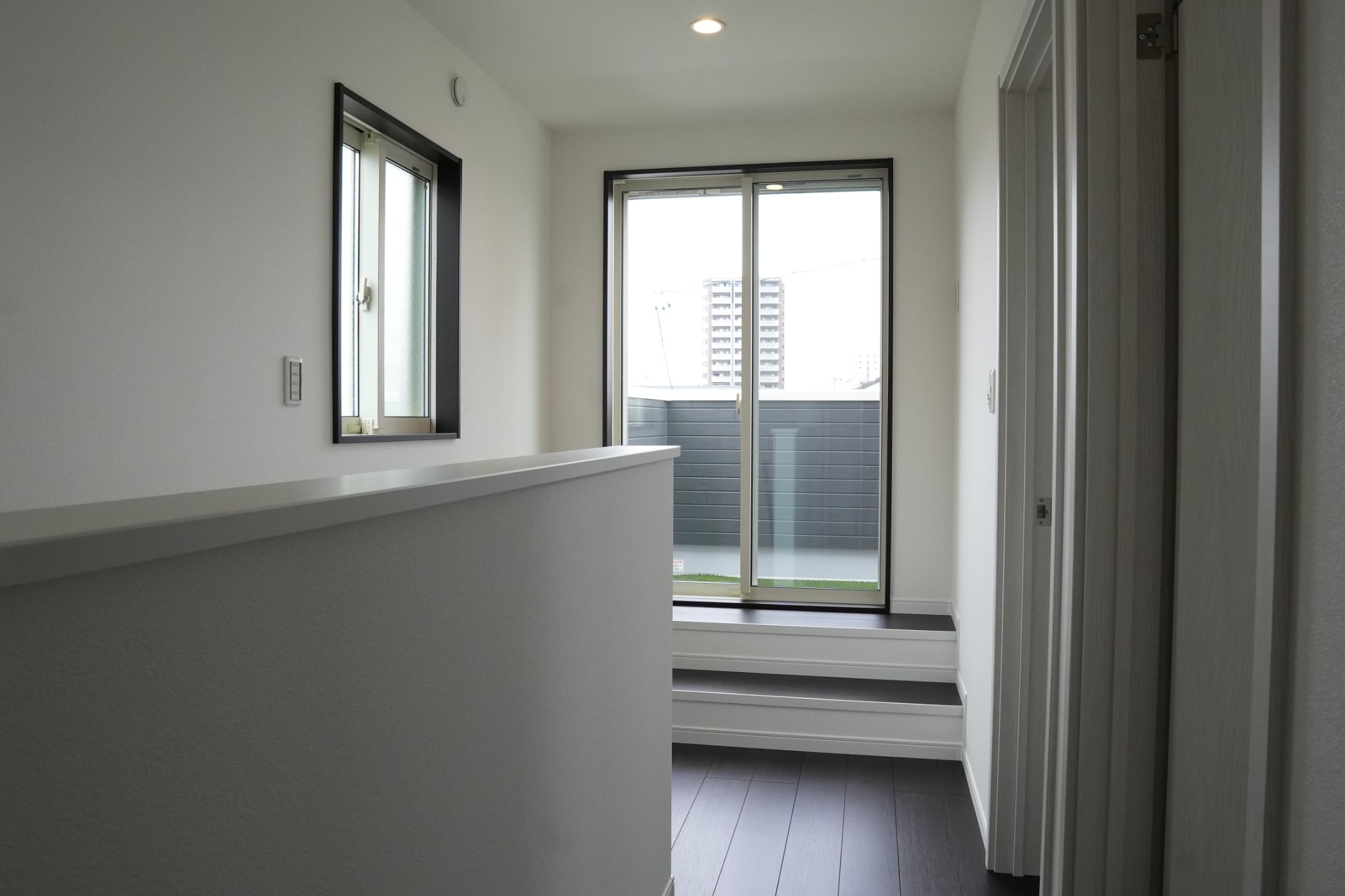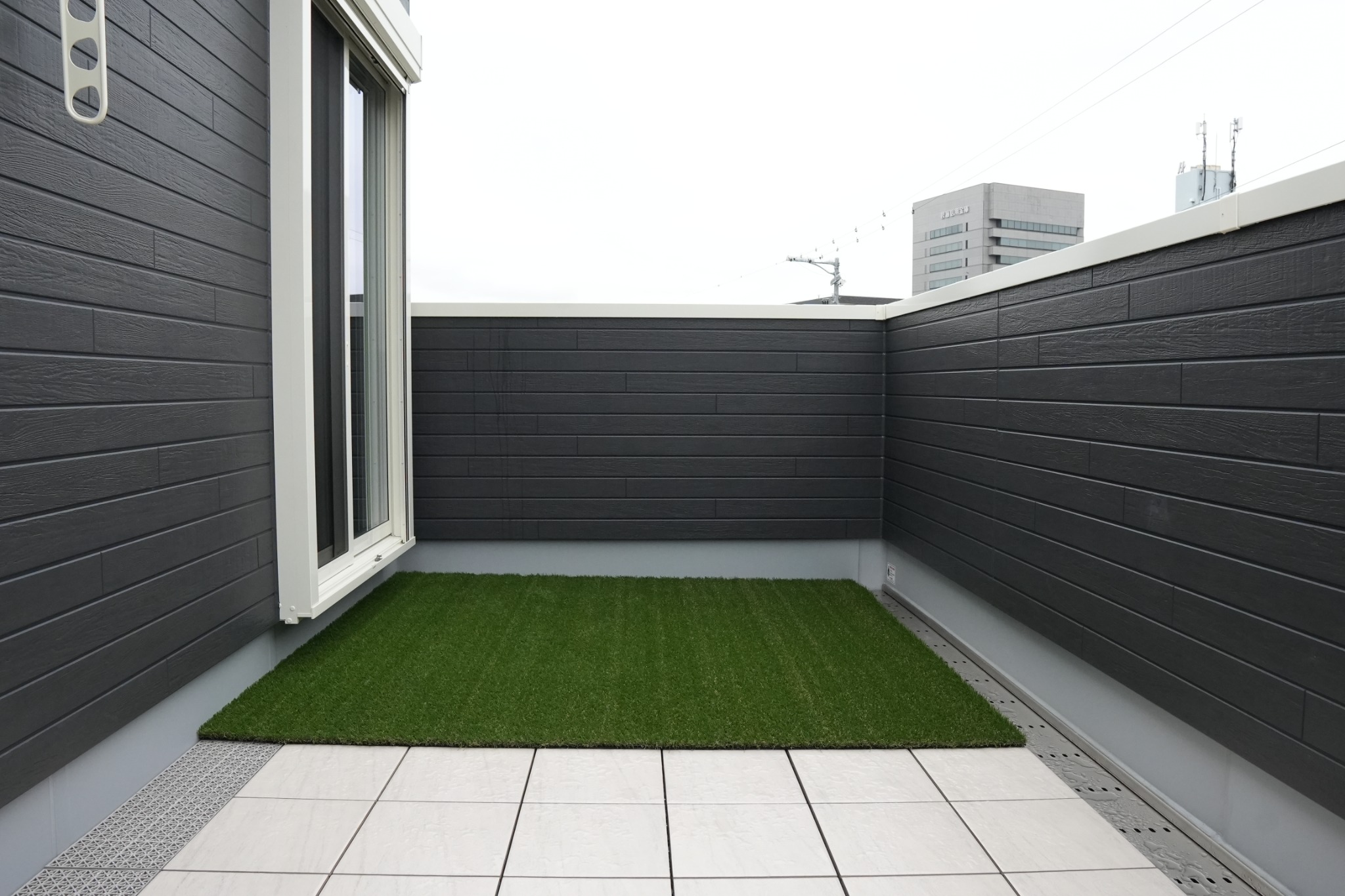 室内からそのままつながる屋上スペース。大きな窓越しに光を取り込み、外と内が緩やかにつながる設計。人工芝を敷いた屋上は、くつろぎや遊びの場として気軽に使えるプライベート空間です。