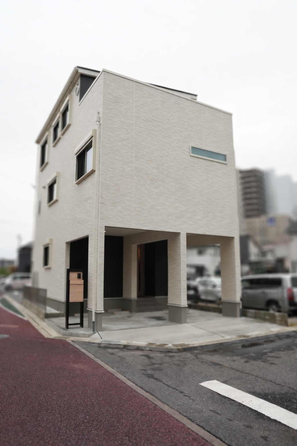 1階ピロティ部分は駐車スペースを確保し、都市部の敷地条件を活かした機能的で洗練された佇まいです。