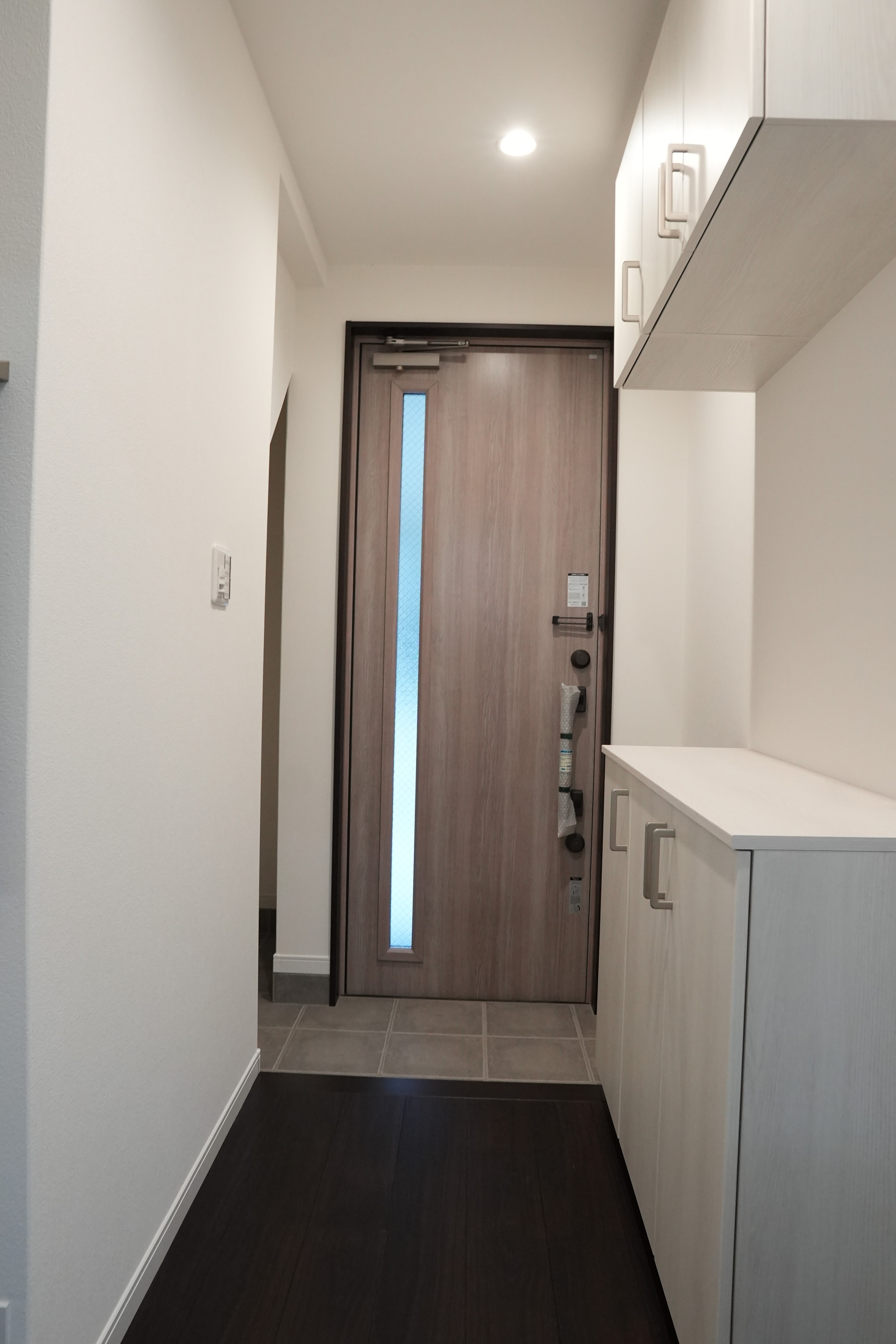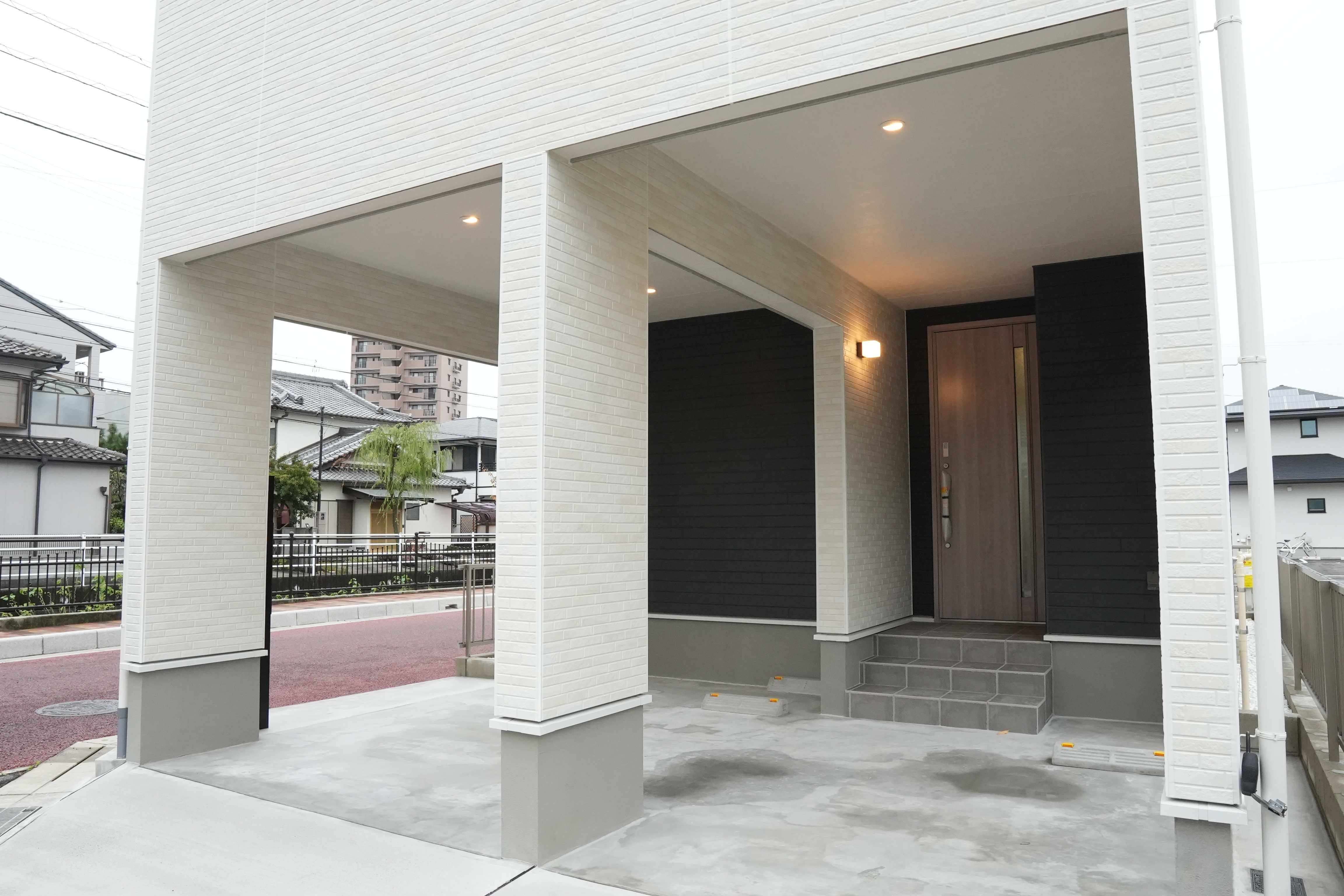 白を基調としたピロティ外観が奥行きと上質感を演出し、玄関へと自然につながるデザイン。室内は木目の玄関ドアと収納で、すっきりと心地よい第一印象をつくります。