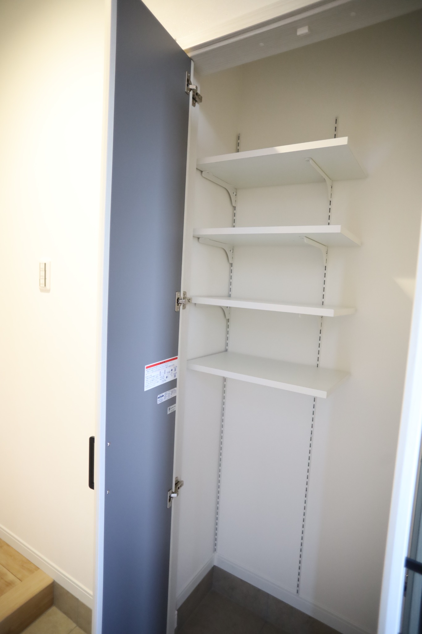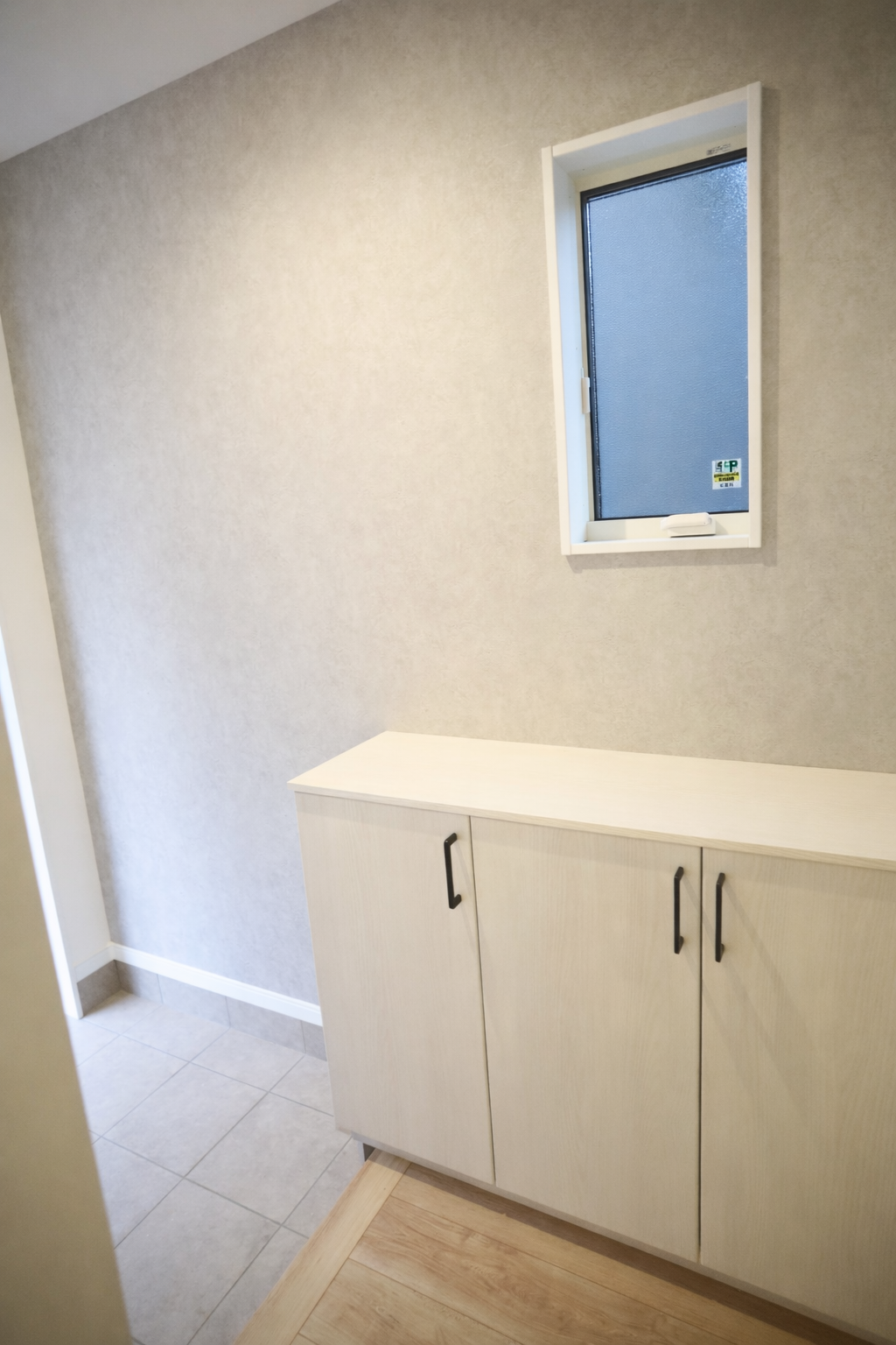 玄関まわりは、やさしい色合いでまとめた明るい空間。収納力のあるシューズボックスと可動棚付き収納で、靴や小物をすっきり整理でき、いつでも気持ちよく迎えられます。