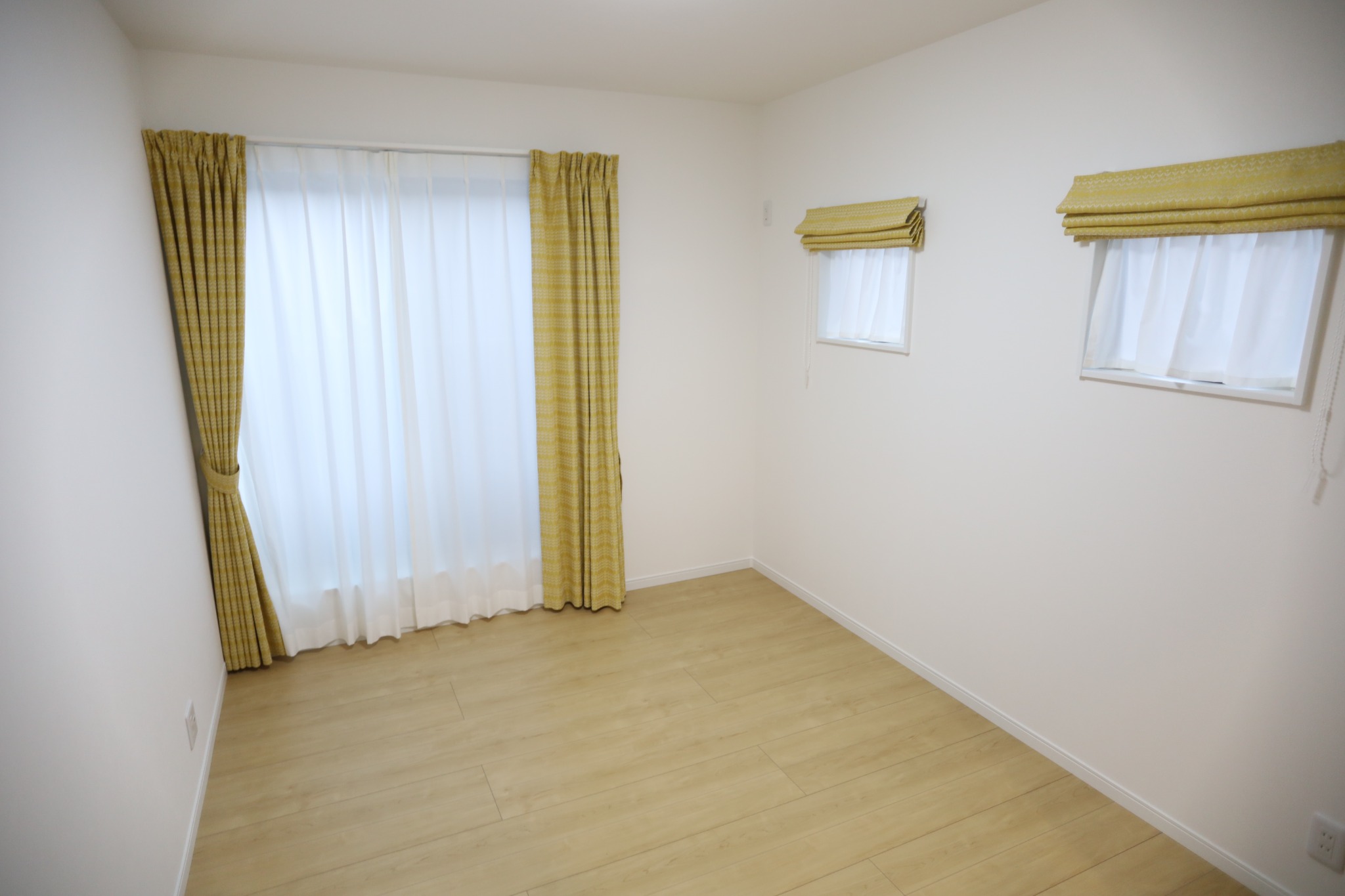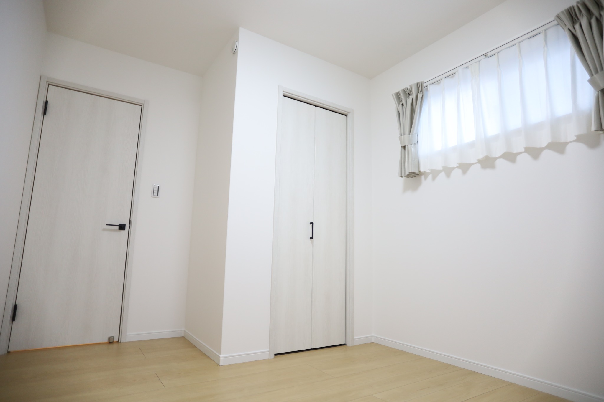 やさしい光が差し込む個室空間。大きな窓と小窓を組み合わせ、明るさとプライバシーを両立。クローゼット付きで、寝室や子ども部屋、書斎など幅広く使えるシンプルな一室です。