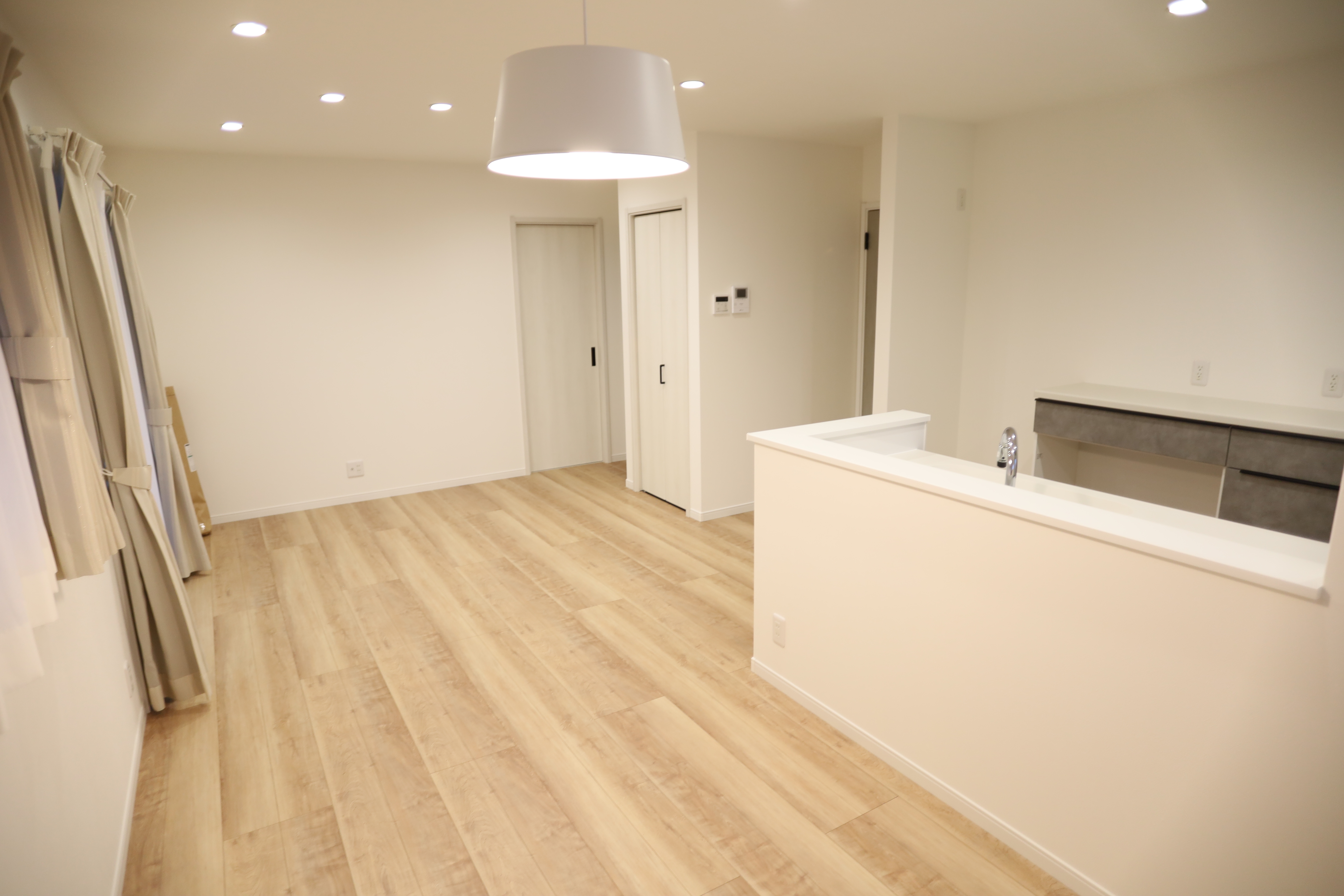 白を基調にした明るいLDKと、動線がスムーズな対面キッチン。やさしい木目の床が空間に温かみを添え、家族の会話が自然と生まれる、心地よい暮らしを叶えます。