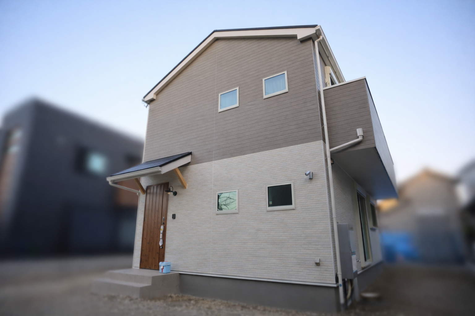 切妻屋根が印象的な、やさしい色合いの外観。木の玄関ドアと軒のデザインが温もりを添え、街並みに自然と溶け込む、落ち着きのある住まいです。