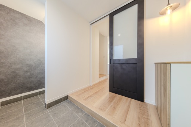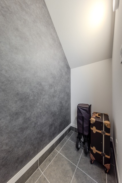 意匠性と実利がクロスする、スマートな「お帰り動線」。玄関からキッチンへダイレクトに繋がる動線上に、この大容量の収納スペースを確保。スーツケースやアウトドア用のワゴン、ベビーカーなどを「畳まず、そのまま」収納できるため、帰宅後の片付けという「名もなき家事」が瞬時に完結します。