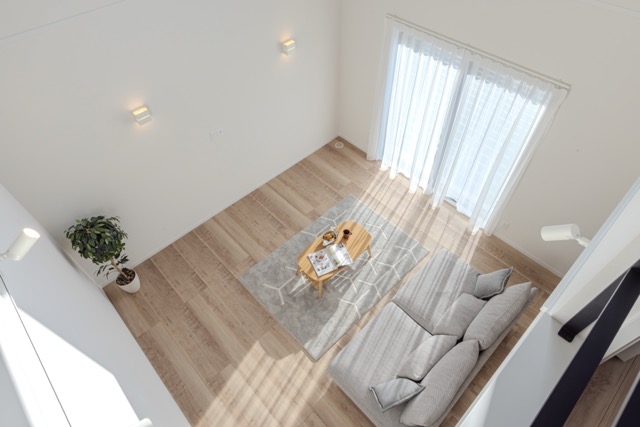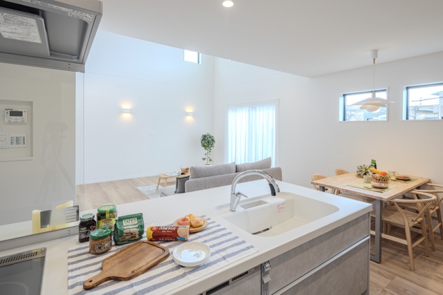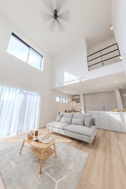 大きな吹き抜けから光が降り注ぐLDKは、開放感と機能美が融合した空間です。
