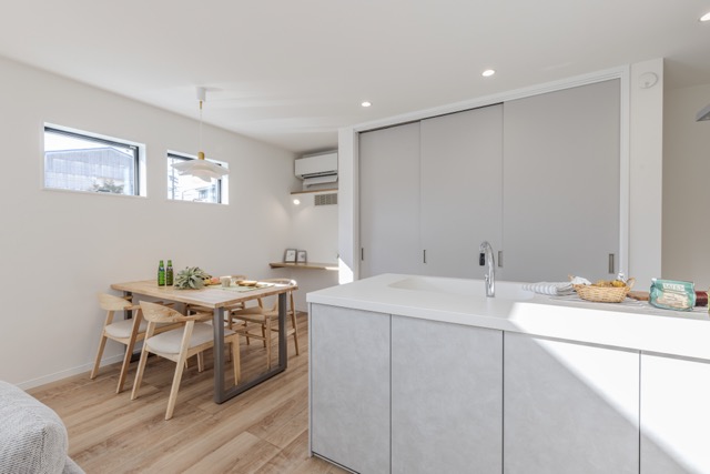 ライトグレーを基調としたミニマルな外観は、街の喧騒から家族を守ります。プライバシーを重視して窓を絞った設計と「しろくま仕様」の圧倒的な断熱・防音性能が、外の雑音や温度変化をシャットアウトし、一歩足を踏み入れた瞬間から心安らぐ空間へと家族を導きます。