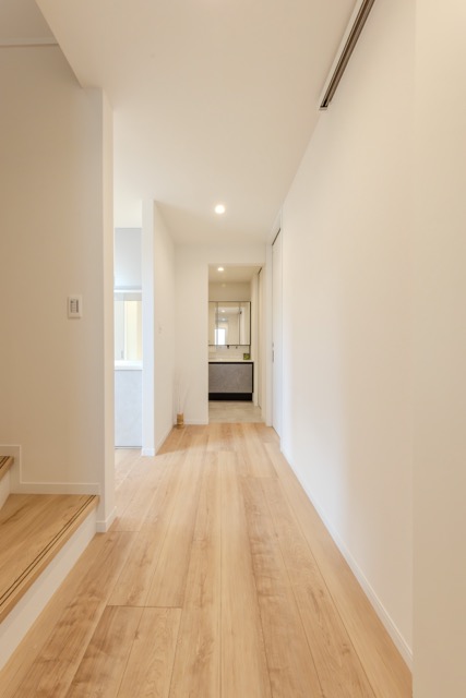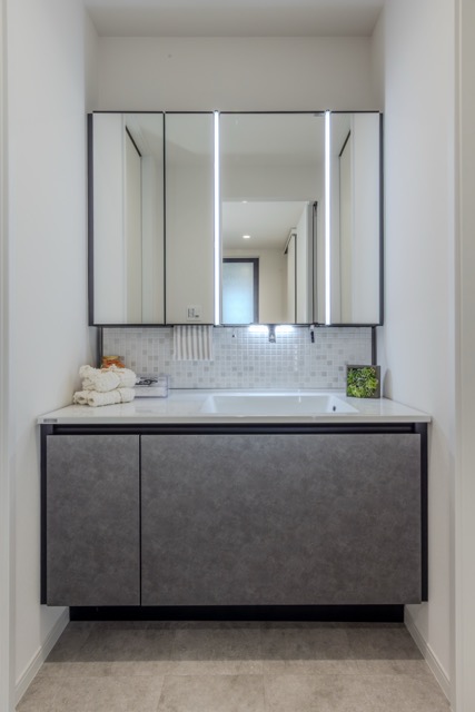 洗面室は、縦型LED照明や広々としたカウンターなど、朝の混雑を防ぐ機能的な設計が特徴。家事動線を最短に繋ぐ配置と洗練された意匠が、共働き世帯の忙しい毎日に心のゆとりを生み出します。