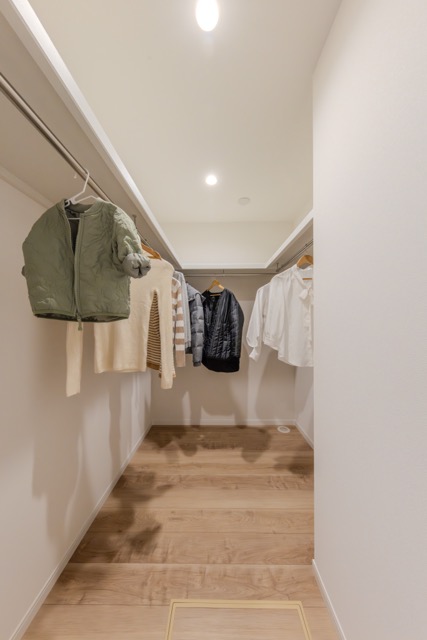 ゆったりとしたウォークインクローゼットは、家族全員の衣類や季節の荷物を「一箇所」にまるごと集約できる大容量の設計。衣替えの手間をゼロにし、洗濯後の片付け動線を最短にする合理的なシステムが、共働き世帯の家事負担を大幅に軽減します。