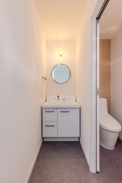 ヘリンボーン柄や照明にこだわったトイレは、メンテナンス性を追求した設備と設計が魅力。第2の洗面台を隣接させた合理的なレイアウトにより、日々の掃除負担を減らし、清潔で心地よい暮らしを支えます。